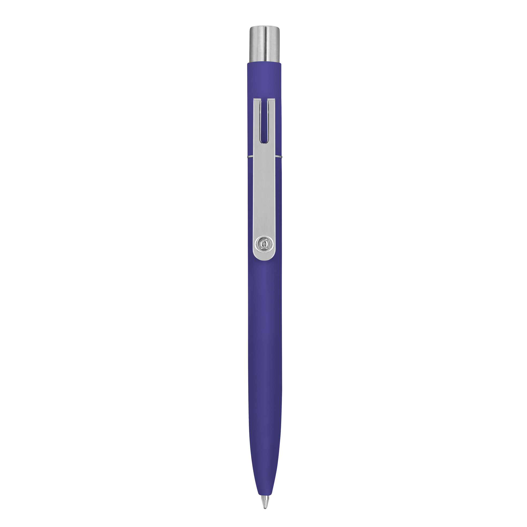 Metal. Cuerpo de aluminio, acabado engomado en diferentes colores, muy suave al tacto. Bolígrafo retráctil. Clip, pulsador y anillo metálicos color plata. Tinta negra. Destape al grabar color plata.