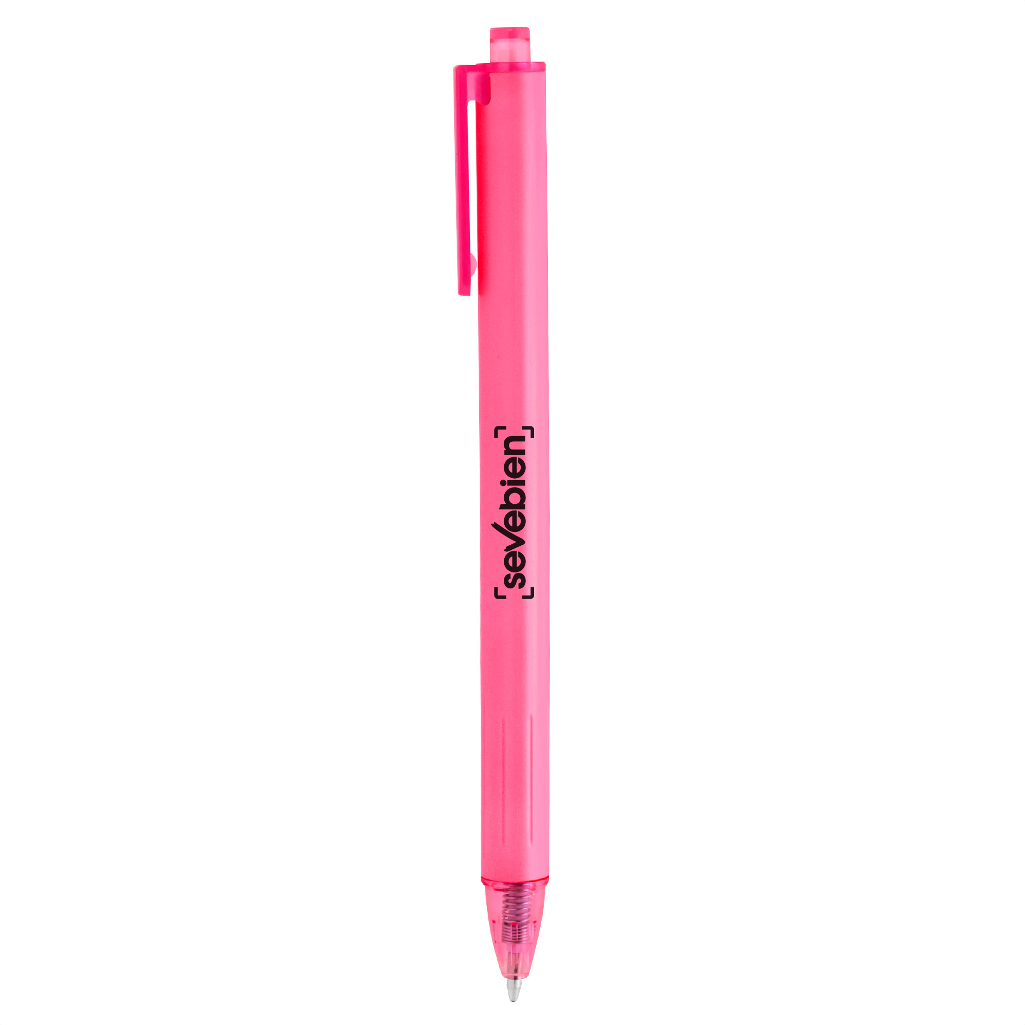 Bolígrafo retráctil. Cuerpo de diferentes colores acabado mate. Pulsador, clip y puntera translucidos del mismo color del cuerpo.