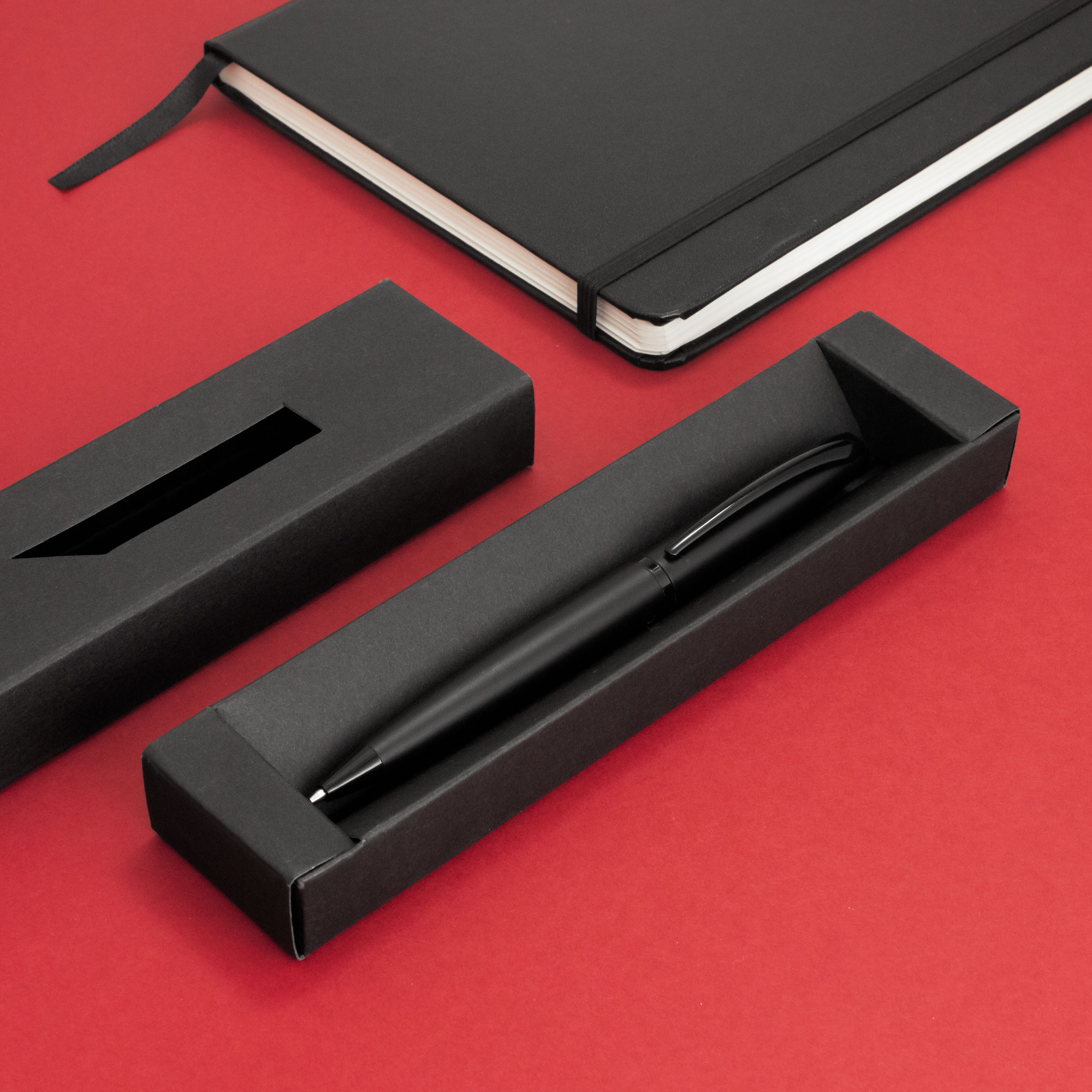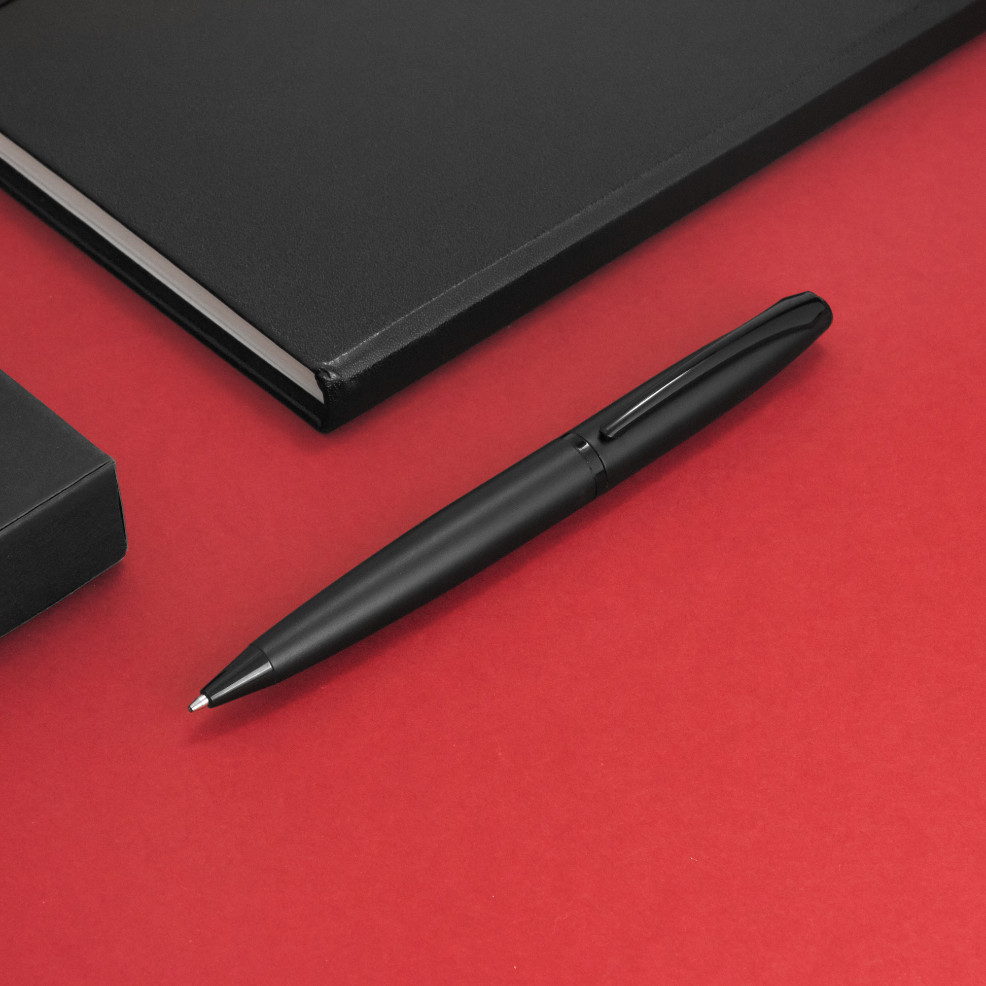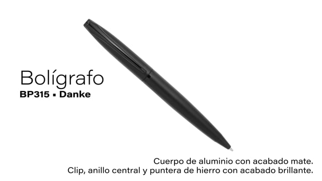 Bolígrafo con apertura giratoria. Cuerpo de aluminio con acabado mate. Clip, anillo central y puntera de hierro con acabado brillante. Refill metálico de origen alemán. Tambor superior con revestimiento galvánico.