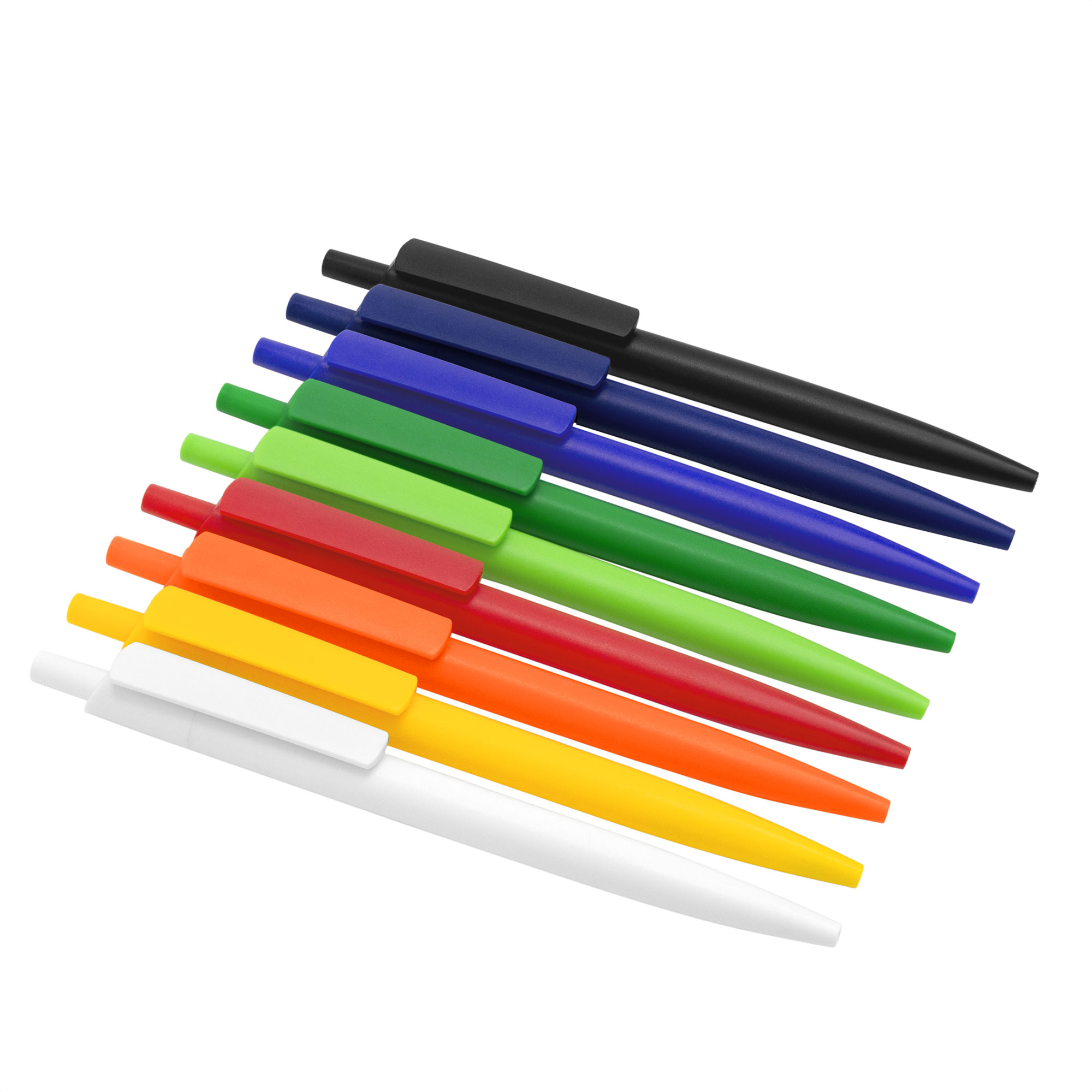 Bolígrafo retráctil. Cuerpo de diferentes colores. Acabado mate. Pulsador, clip y puntera del mismo color del cuerpo.  Amplia área de impresión.