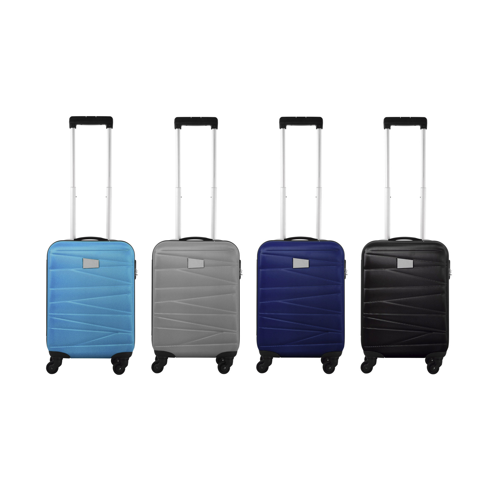 54 x 34 x 20 cm. (total). Capacidad 31 litros (Indica el volumen, NO el peso). ABS. Valija / Maleta pequeña. 4 ruedas con giro 360°. Manija de transporte reforzada. Mango extensible hasta 54 cm. 2 posiciones. Interior: 2 compartimentos principales con cierre y elásticos ajustables. Placa metálica desmontable para grabado (medida: 6 x 4 cm.) Candado incluido con combinación.