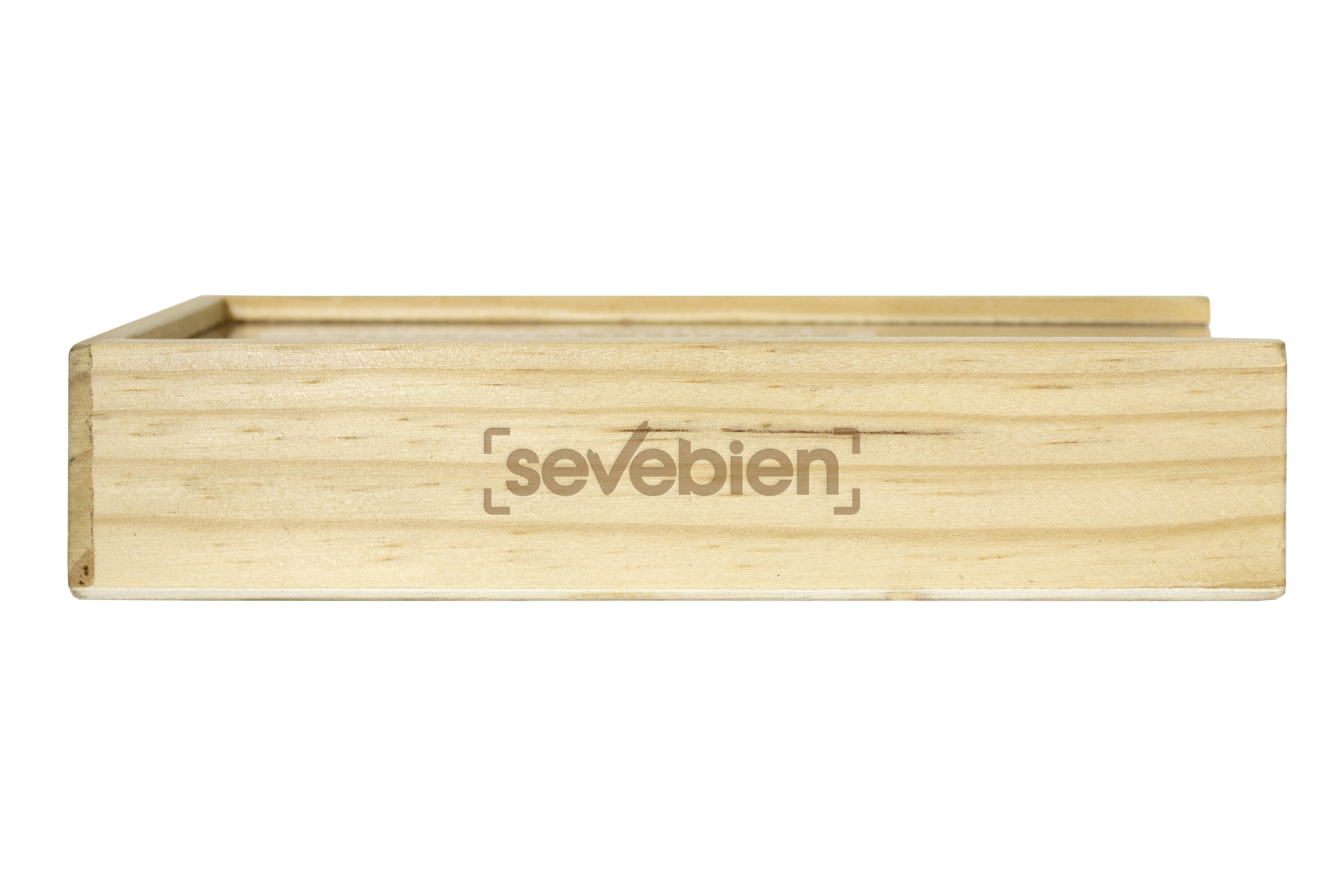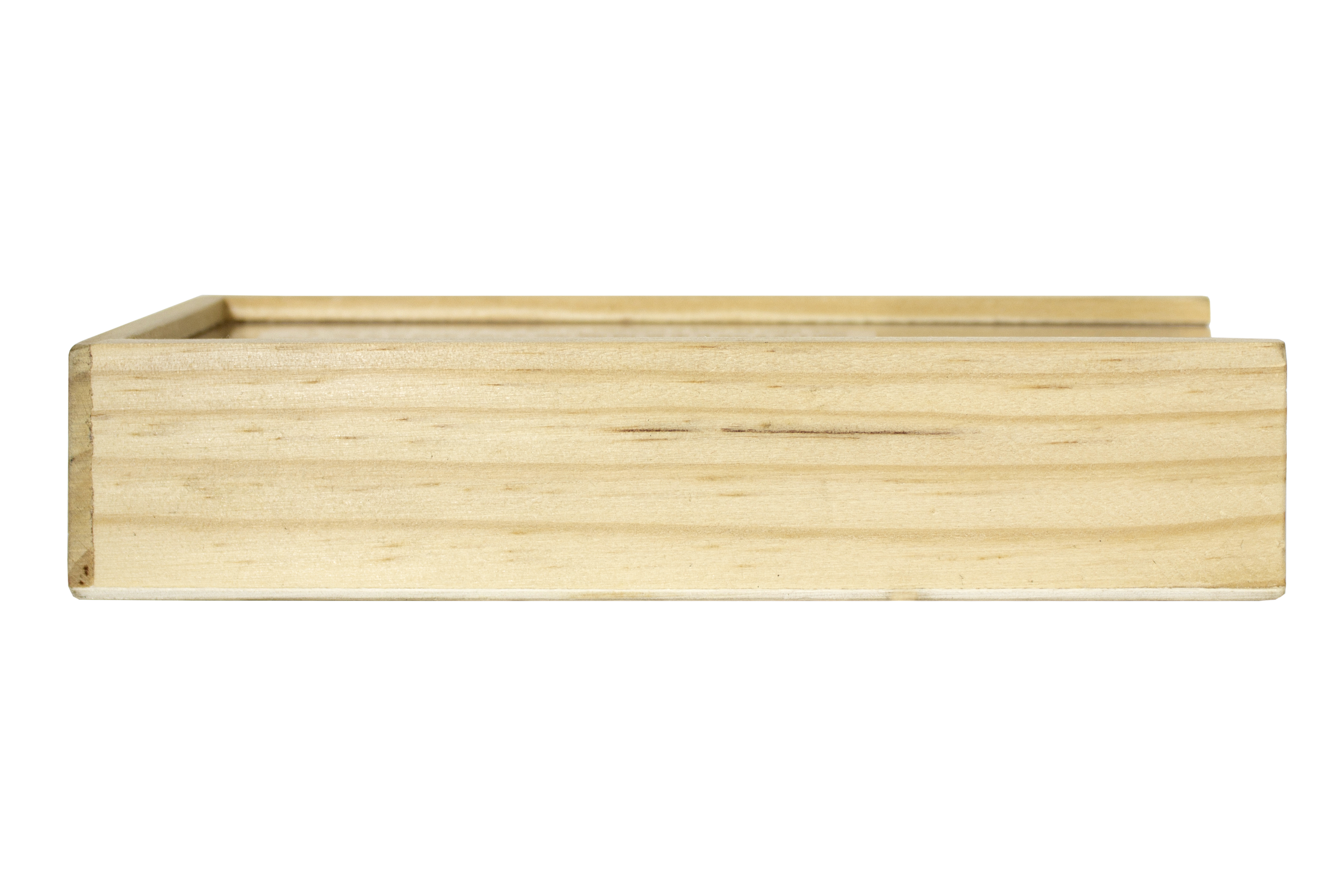 15 x 5 x 3 cm. Madera y plástico. Juego de dominó con 28 piezas de madera pintadas de negro, caja de madera y tapa plástica transparente. Manual de instrucciones dentro de la caja. Presentación en caja de regalo.