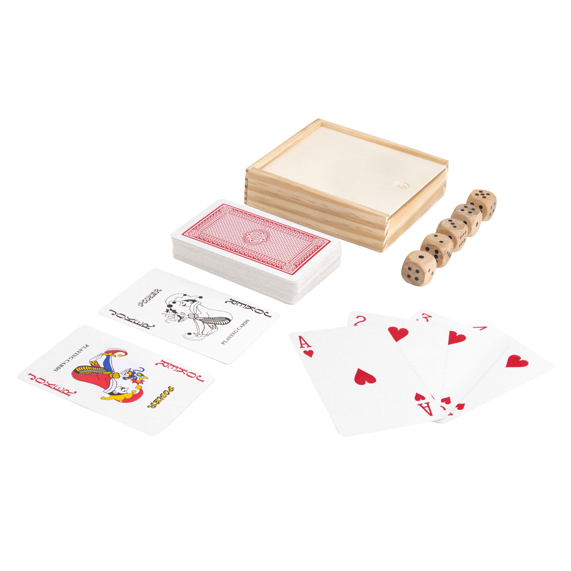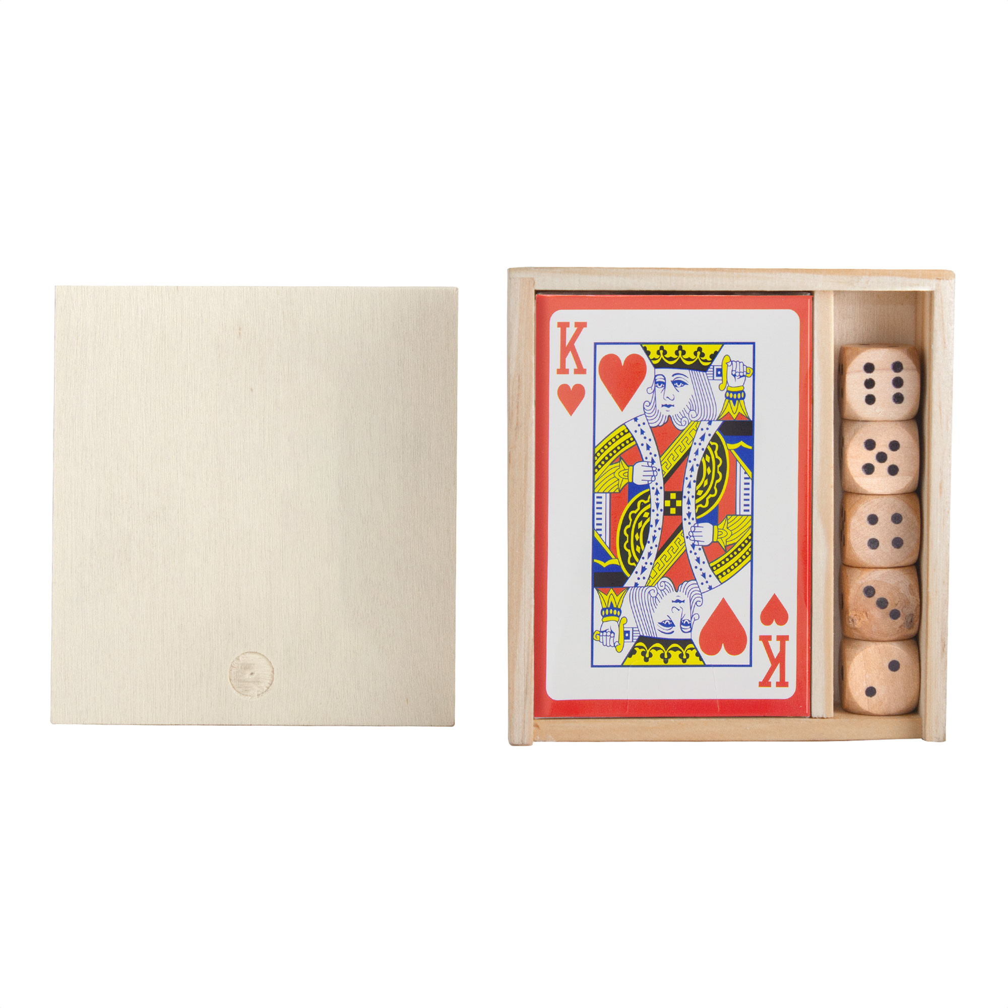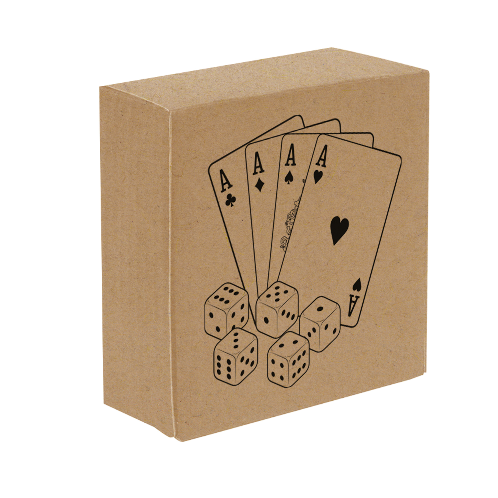 10 x 9,4 x 2,5 cm. Madera y papel plastificado. Set de entretenimiento. Incluye: 1 juego de cartas de poker plastificadas y 5 dados de madera de cerezo. Caja contenedora de madera de pino y tapa en polywood. Presentación en caja de regalo kraft.