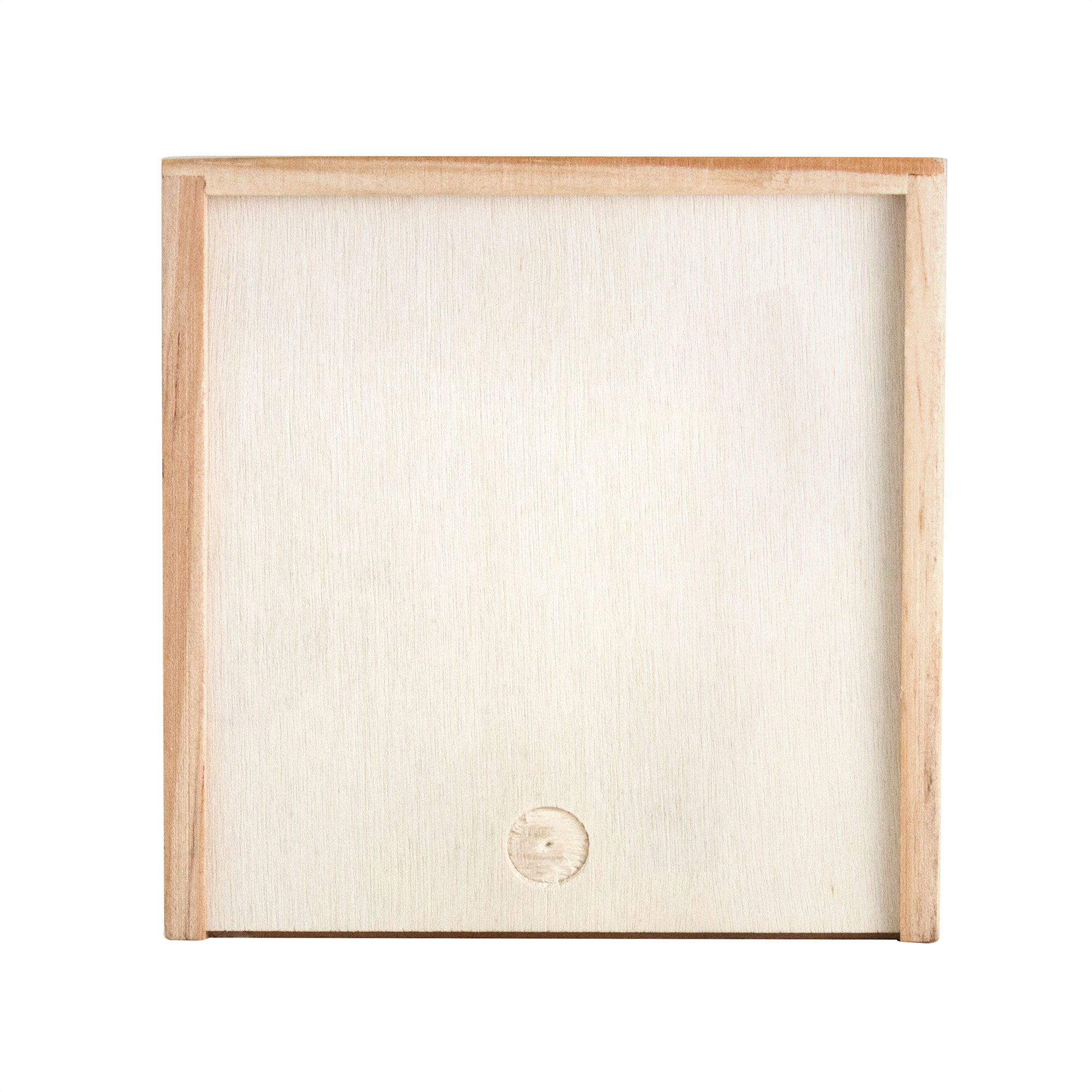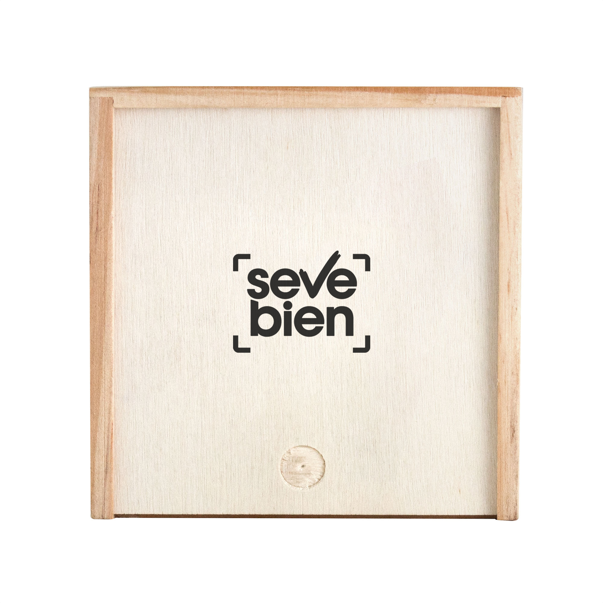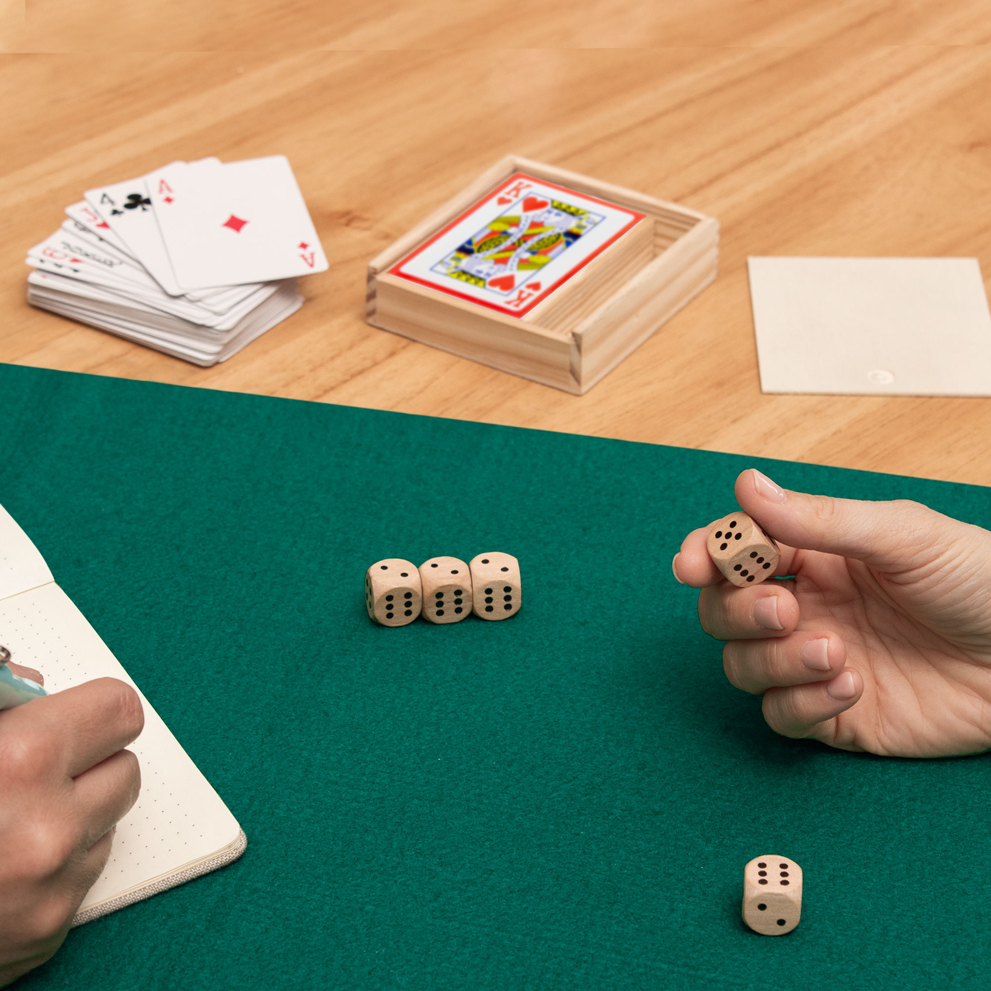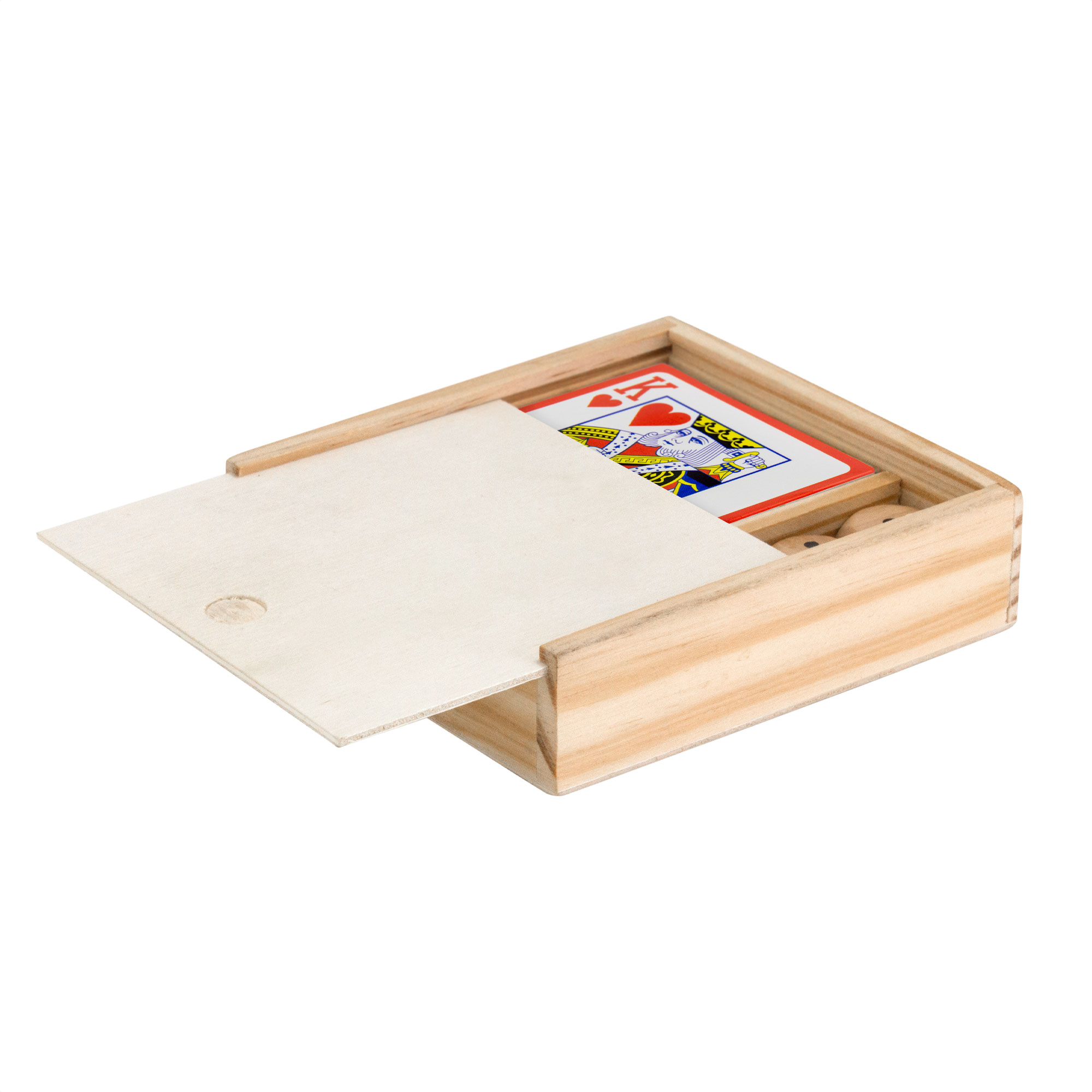 10 x 9,4 x 2,5 cm. Madera y papel plastificado. Set de entretenimiento. Incluye: 1 juego de cartas de poker plastificadas y 5 dados de madera de cerezo. Caja contenedora de madera de pino y tapa en polywood. Presentación en caja de regalo kraft.