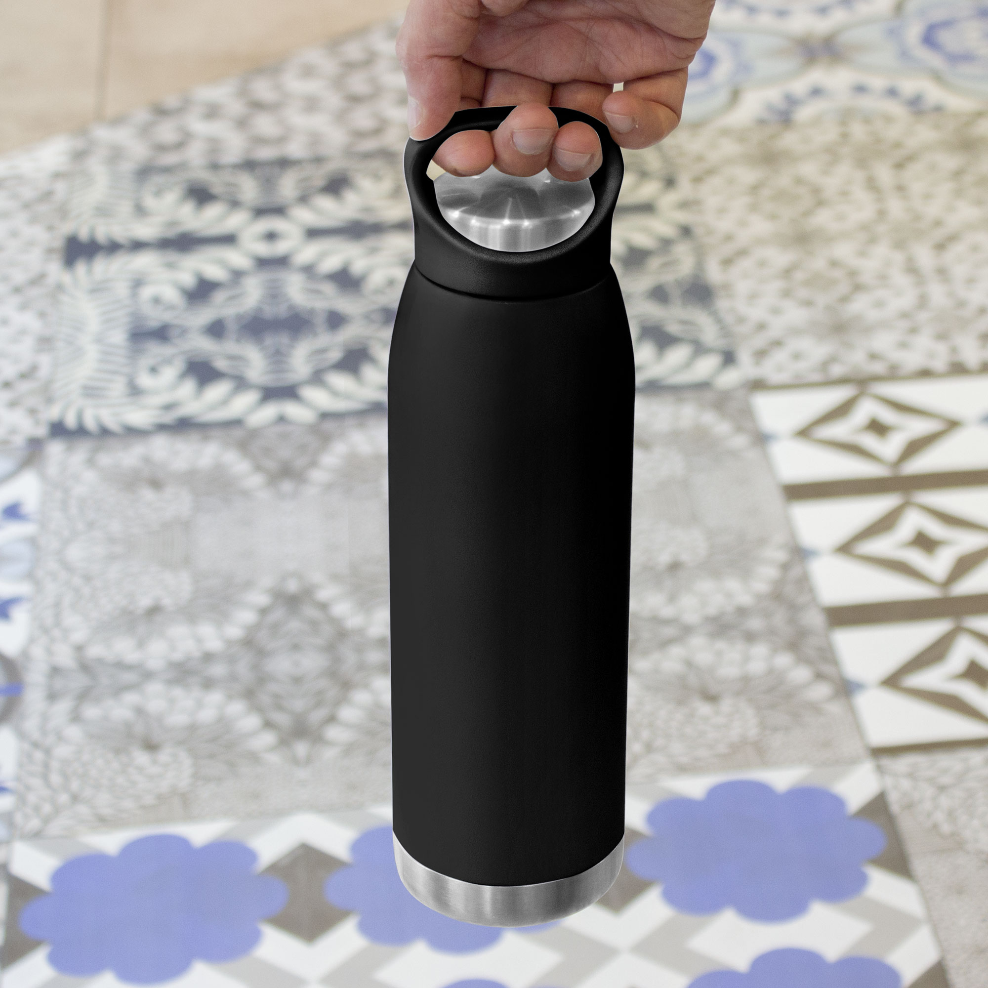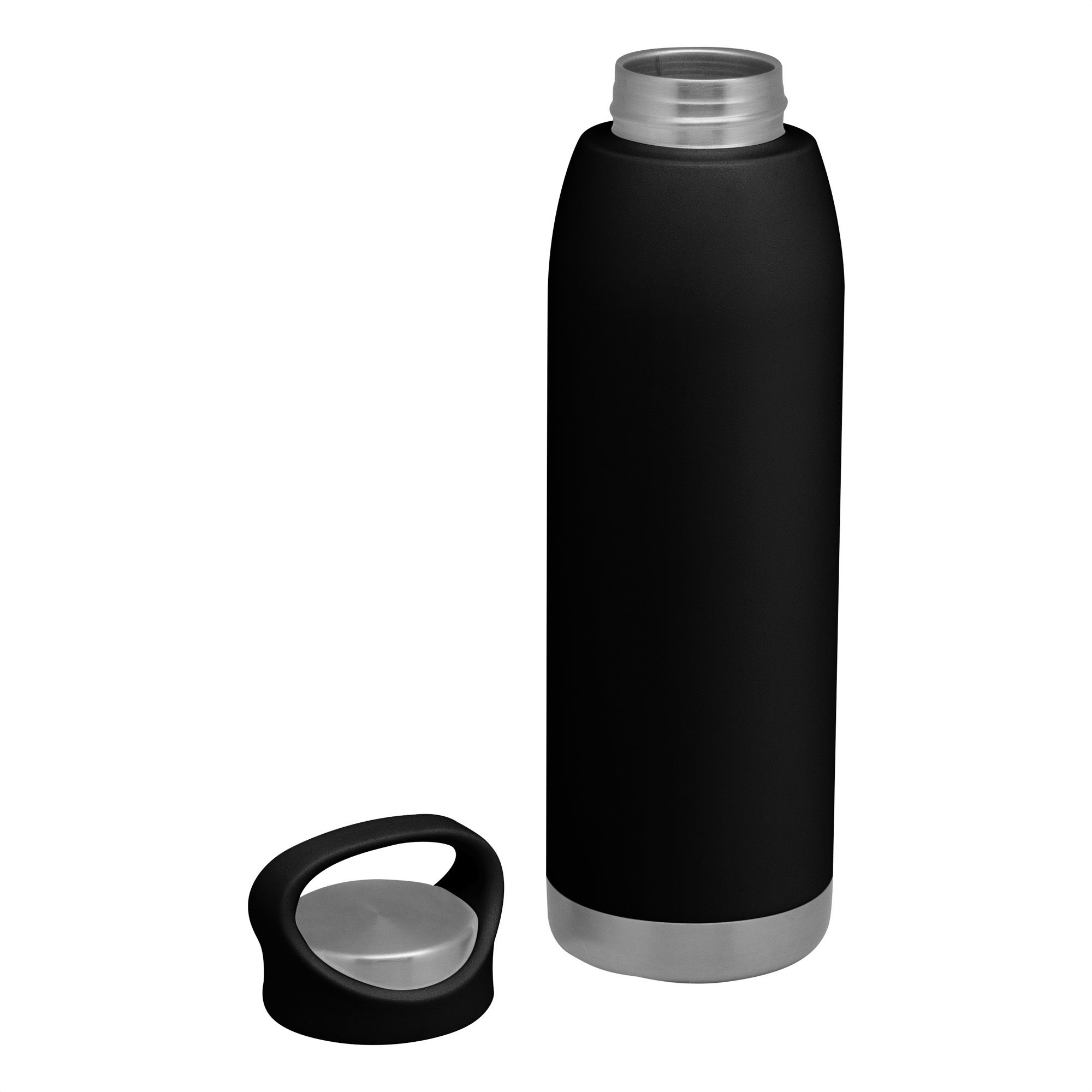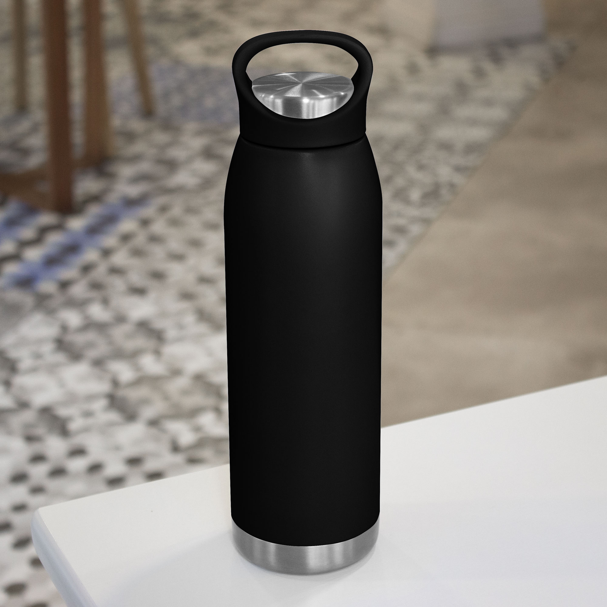 Ø 7,6 x 26,5 cm. Capacidad 600 ml. Acero inoxidable. Botella doble pared, sellada al vacío. Botella con aislamiento térmico. Tecnología vacuum. Interior en acero 304 y exterior en acero 201. Pintura en colores mate. Tapa combinada en plástico del mismo color de la botella y acero inoxidable 201. Mantiene hasta 12 hs la temperatura de las bebidas calientes y 24 hs de las bebidas frías. Presentación en caja de regalo.
