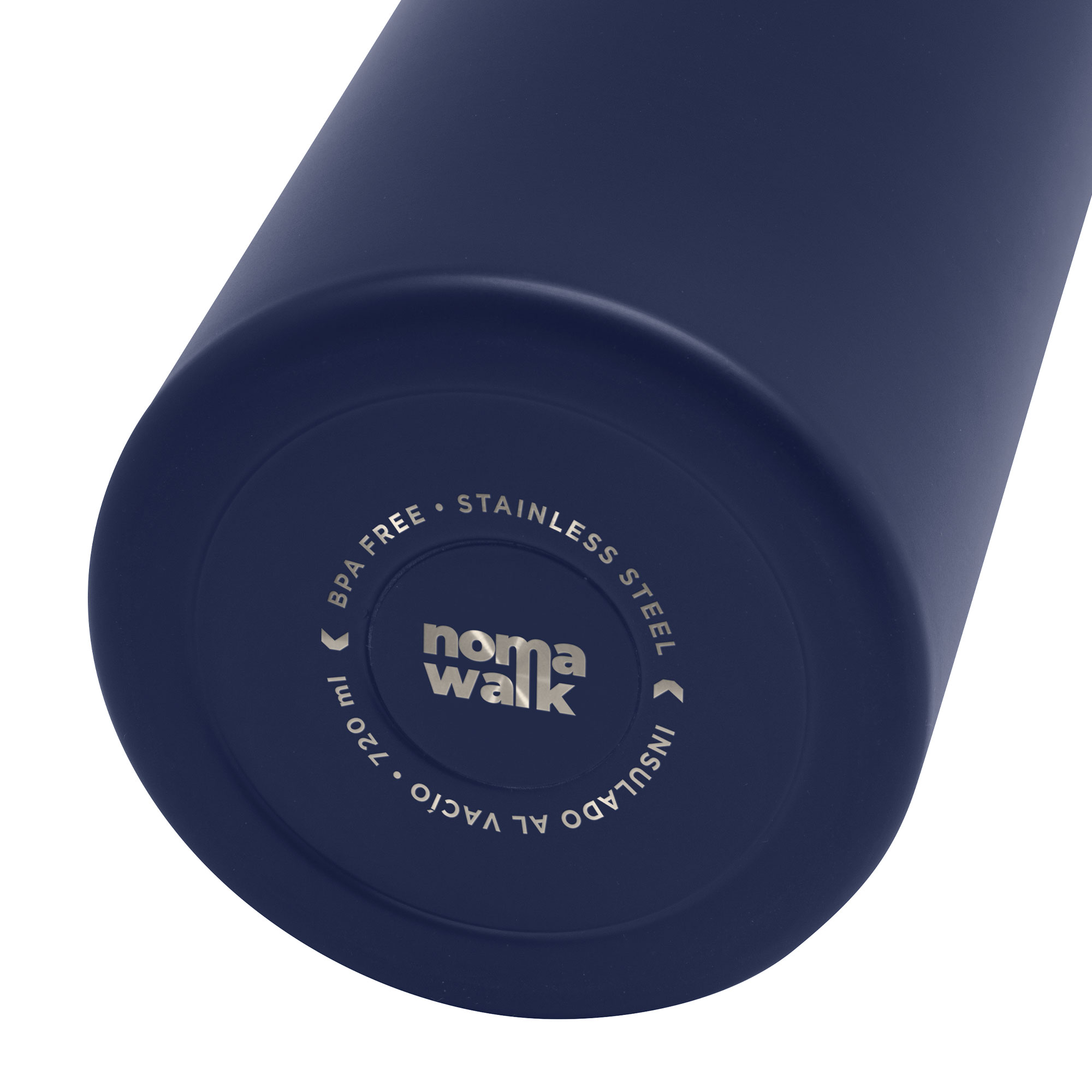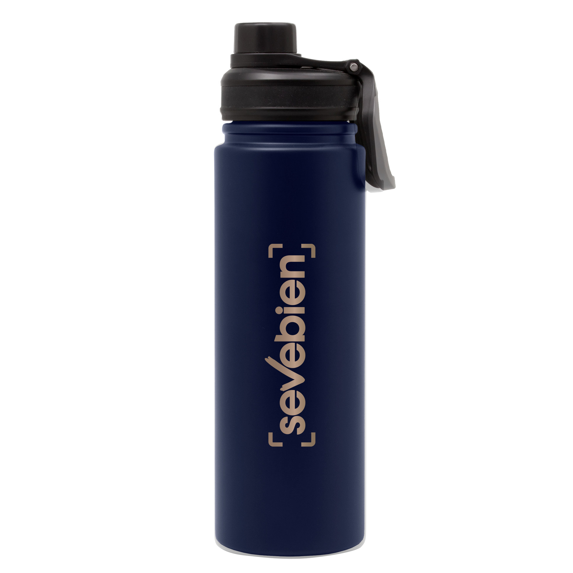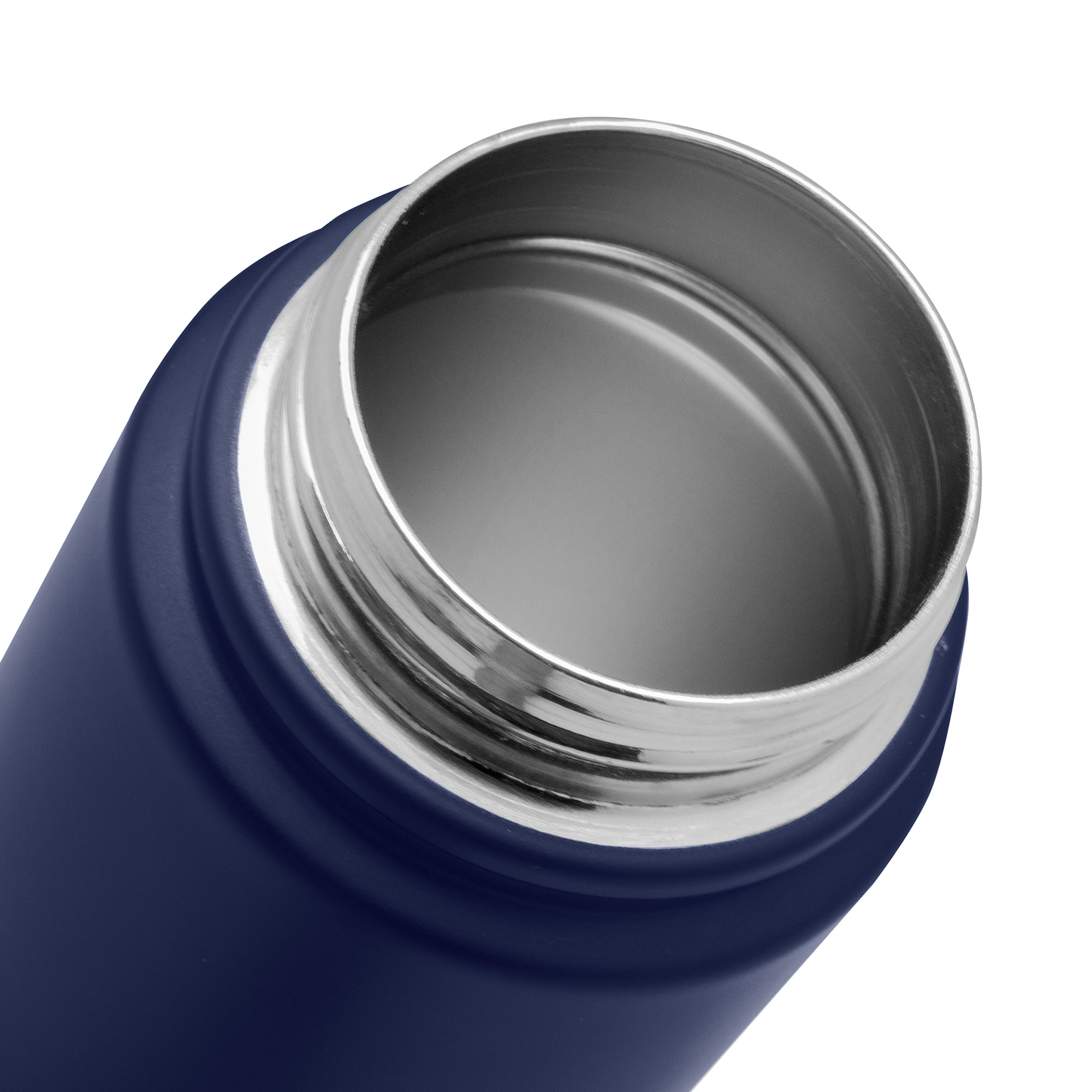 Botella doble pared, sellada al vacío. Interior en acero 304 y exterior en acero 201. Tapa con anillo de silicona, boquilla con cierre a rosca antiderrame y manija plástica para su agarre. Mantiene hasta 12 hs la temperatura de las bebidas calientes y 24 hs de las bebidas frías.