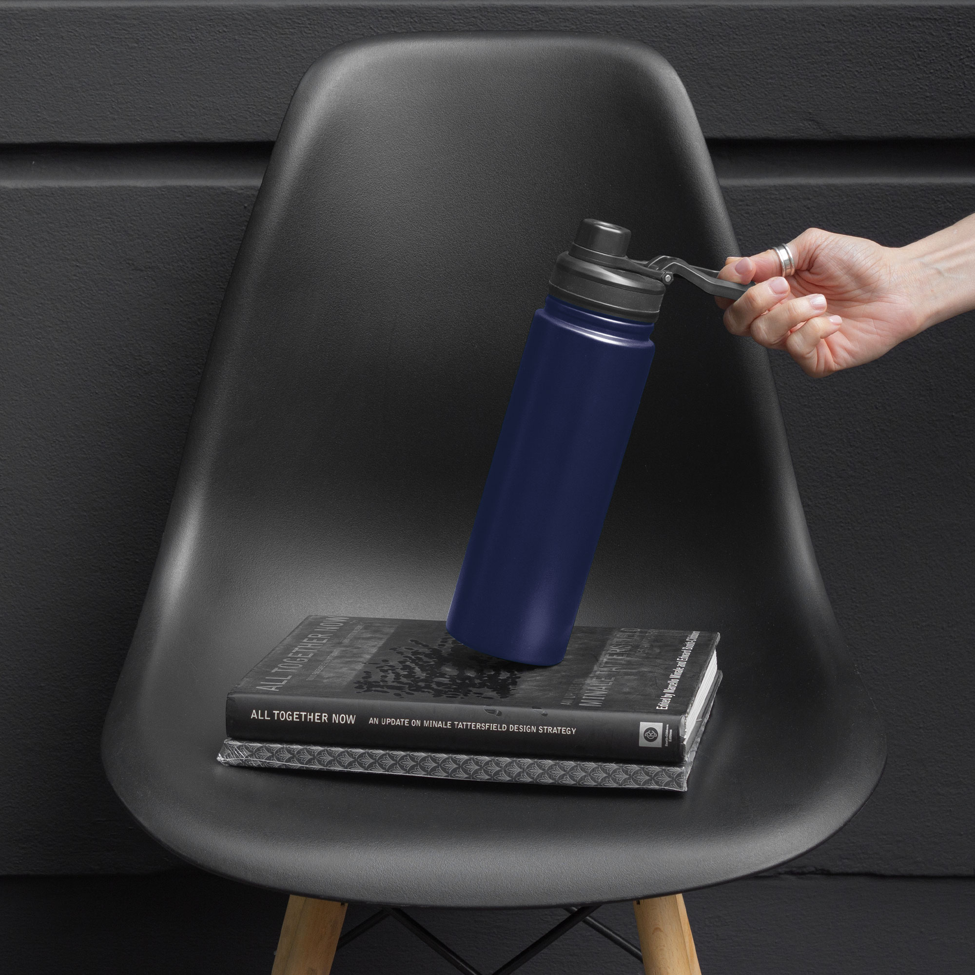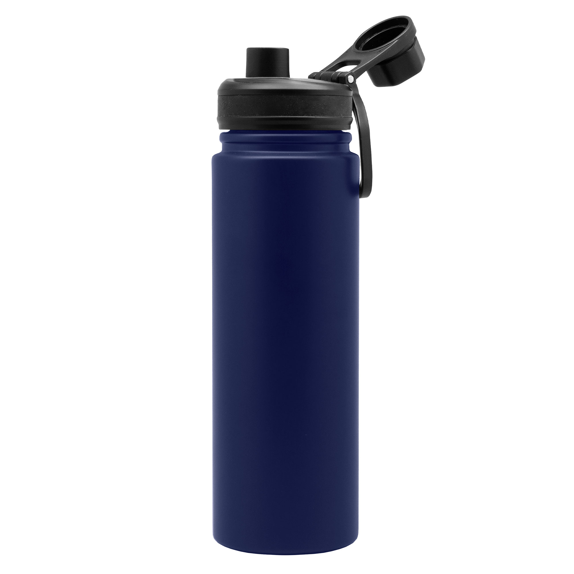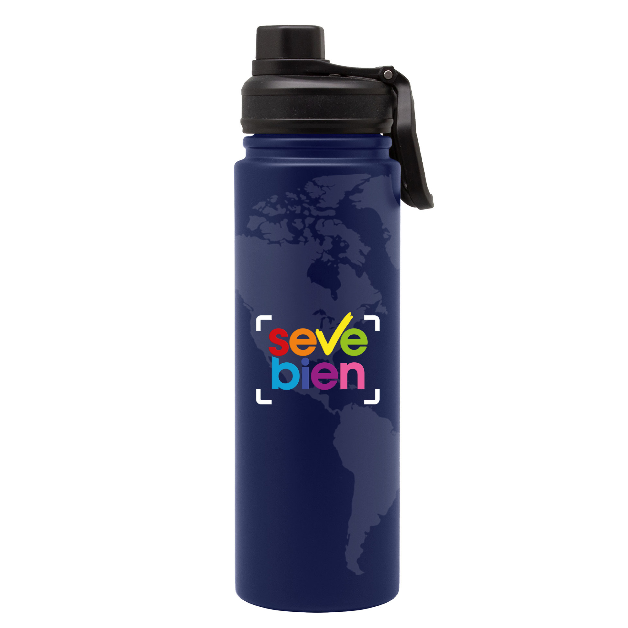 Botella doble pared, sellada al vacío. Interior en acero 304 y exterior en acero 201. Tapa con anillo de silicona, boquilla con cierre a rosca antiderrame y manija plástica para su agarre. Mantiene hasta 12 hs la temperatura de las bebidas calientes y 24 hs de las bebidas frías.