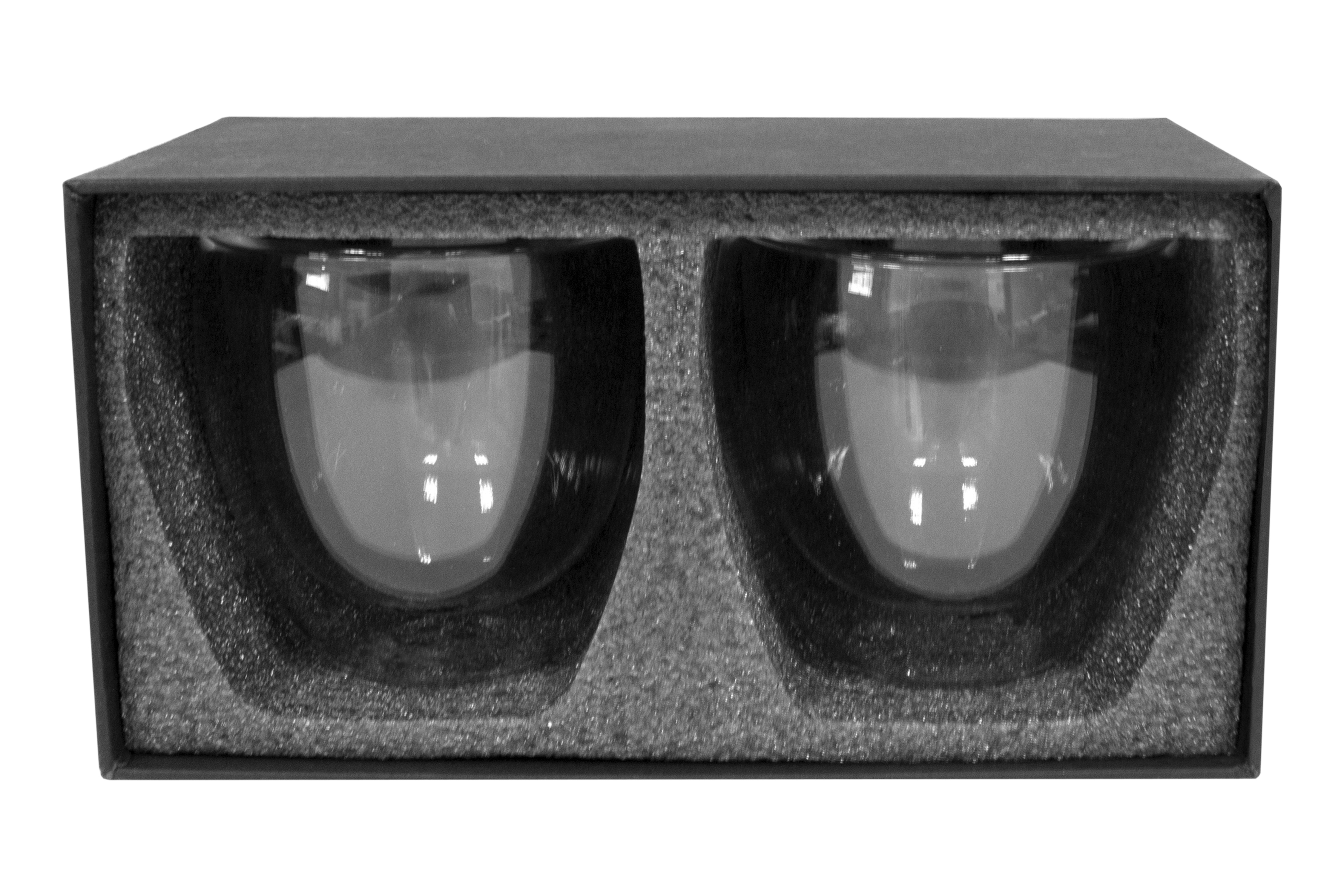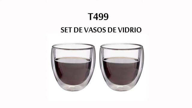 Ø 8 x 8 cm. Capacidad 220 ml cada vaso. Vidrio. Set de dos vasos doble pared. Apto para bebidas frías y calientes. Presentación en caja de regalo.