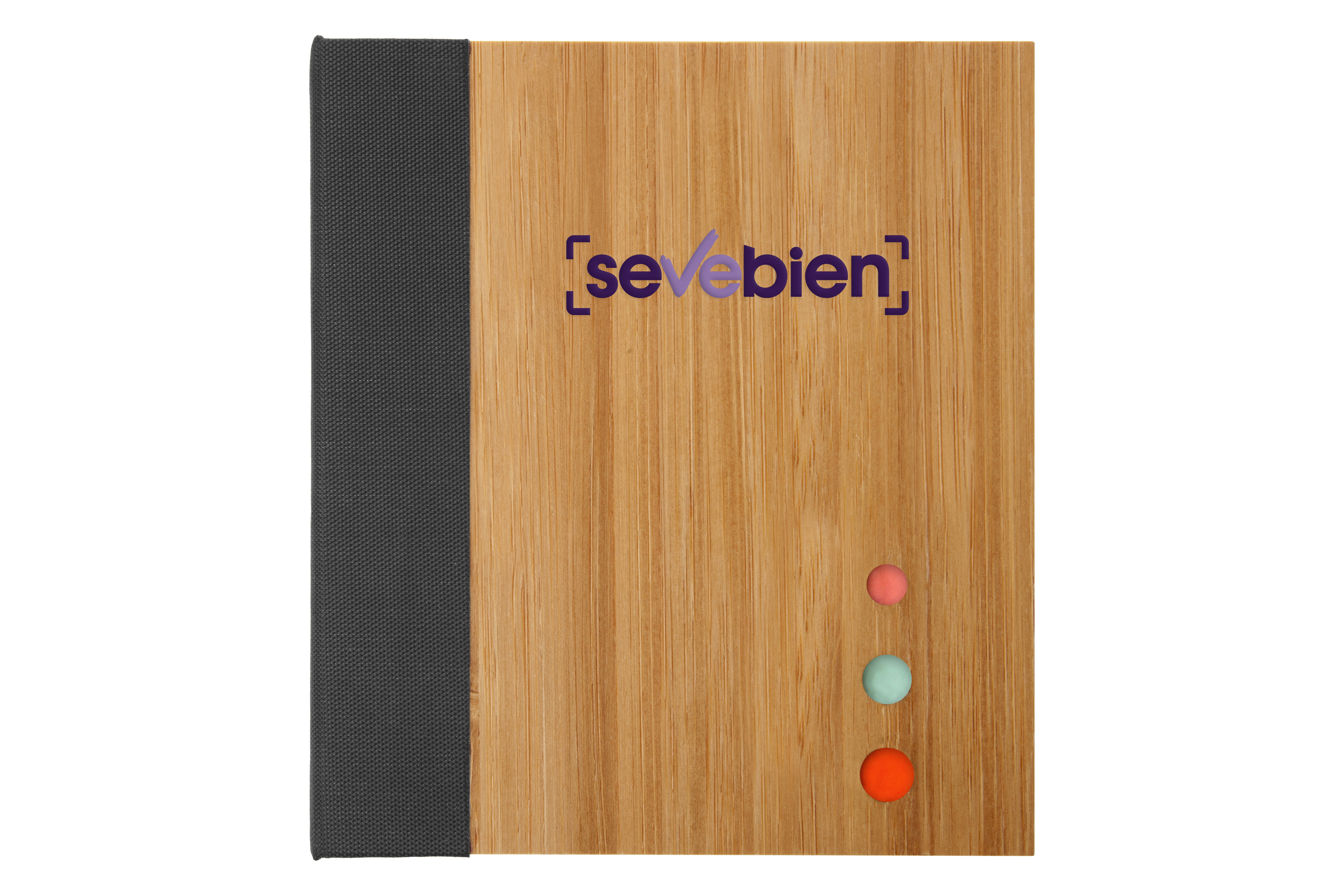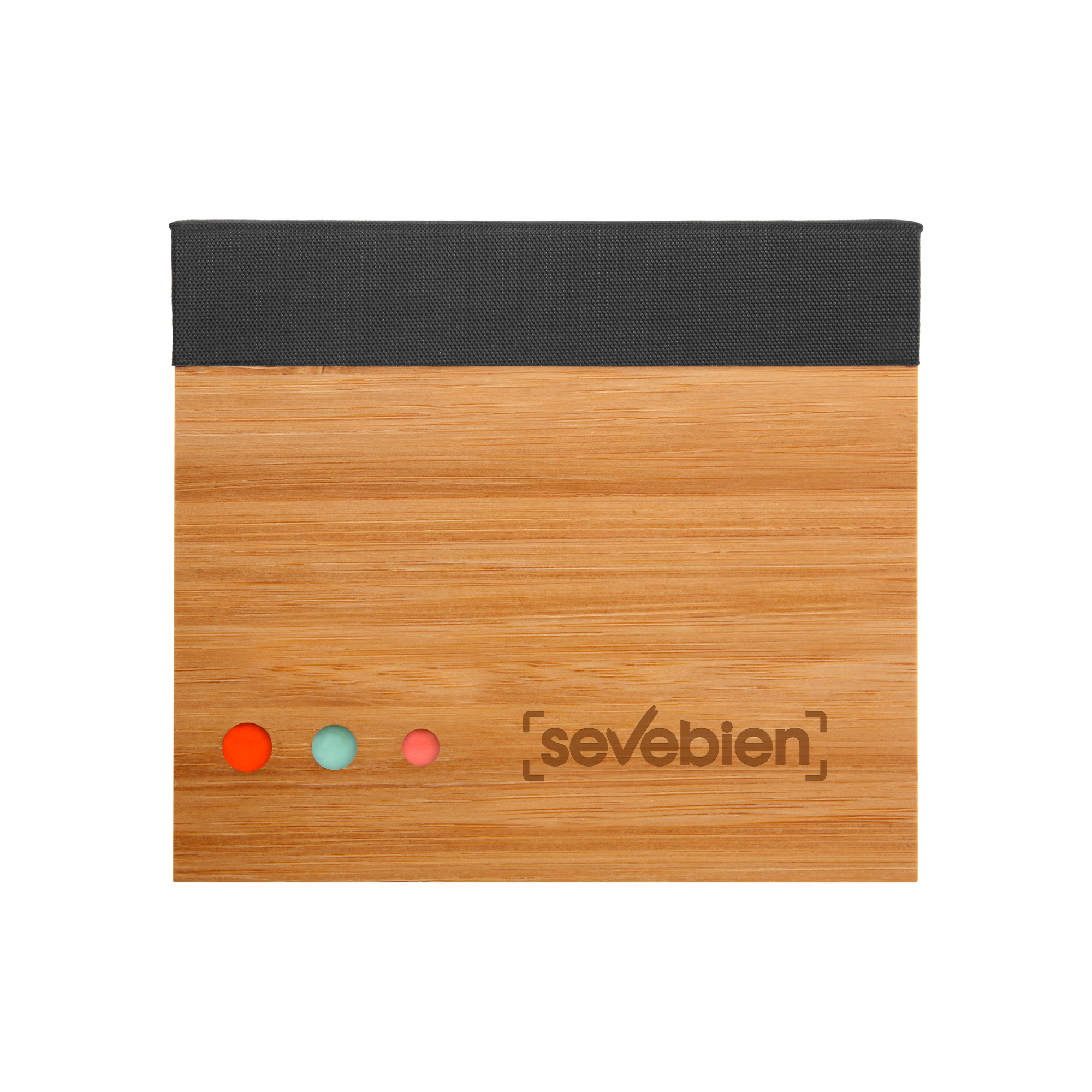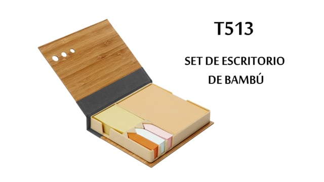 12 x 10,5 x 2 cm. Bambú. Contiene un bloc adhesivo rectangular de papel reciclado, un bloc adhesivo pequeño de color y 3 blocs en forma de flecha. El exterior del estuche es de bambú con detalles de tela, el interior es de plástico con divisiones. Presentación en caja de regalo.