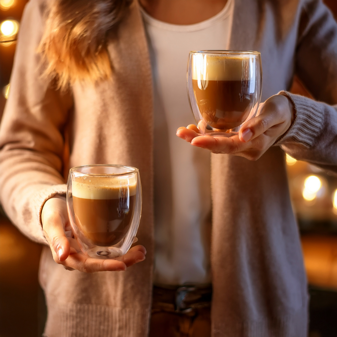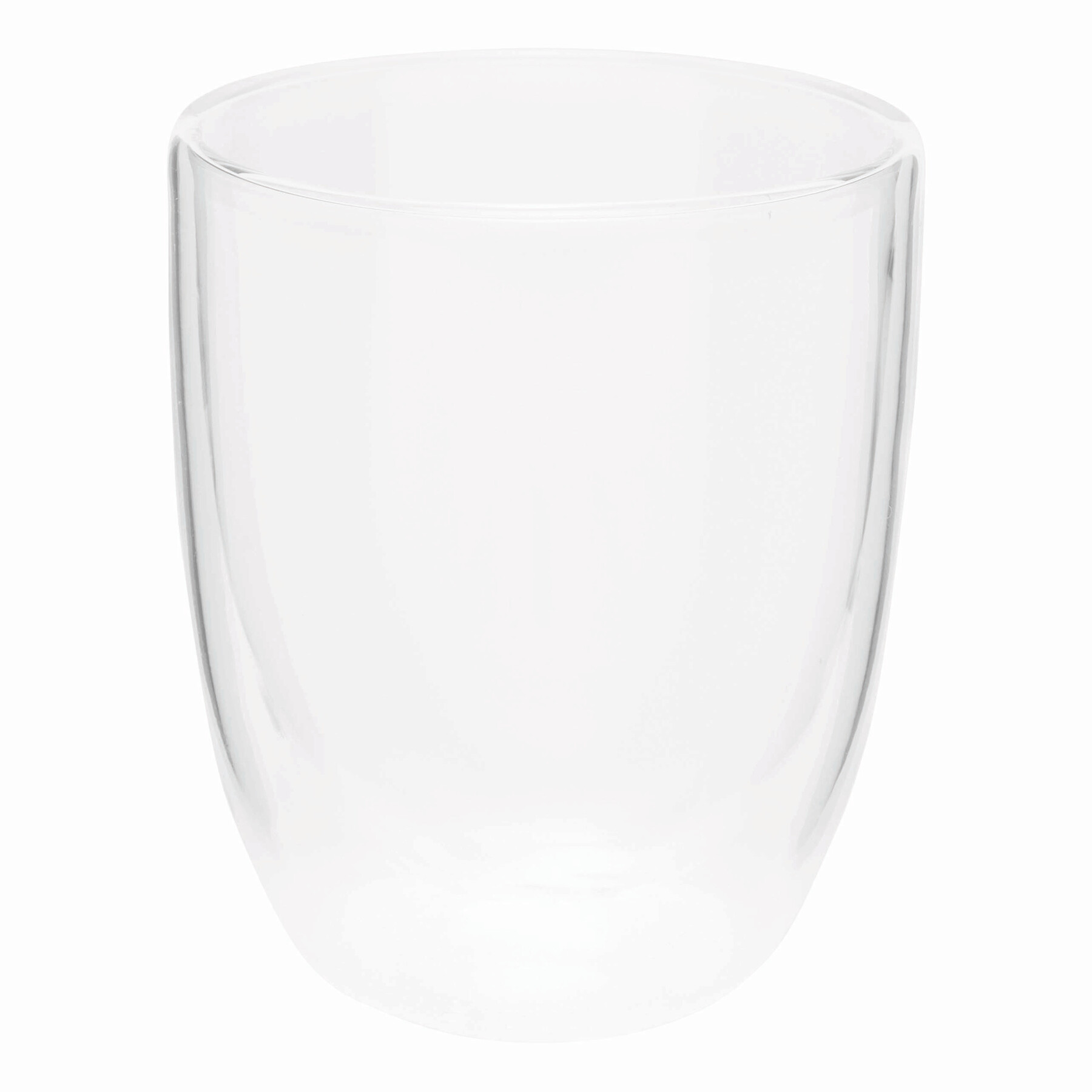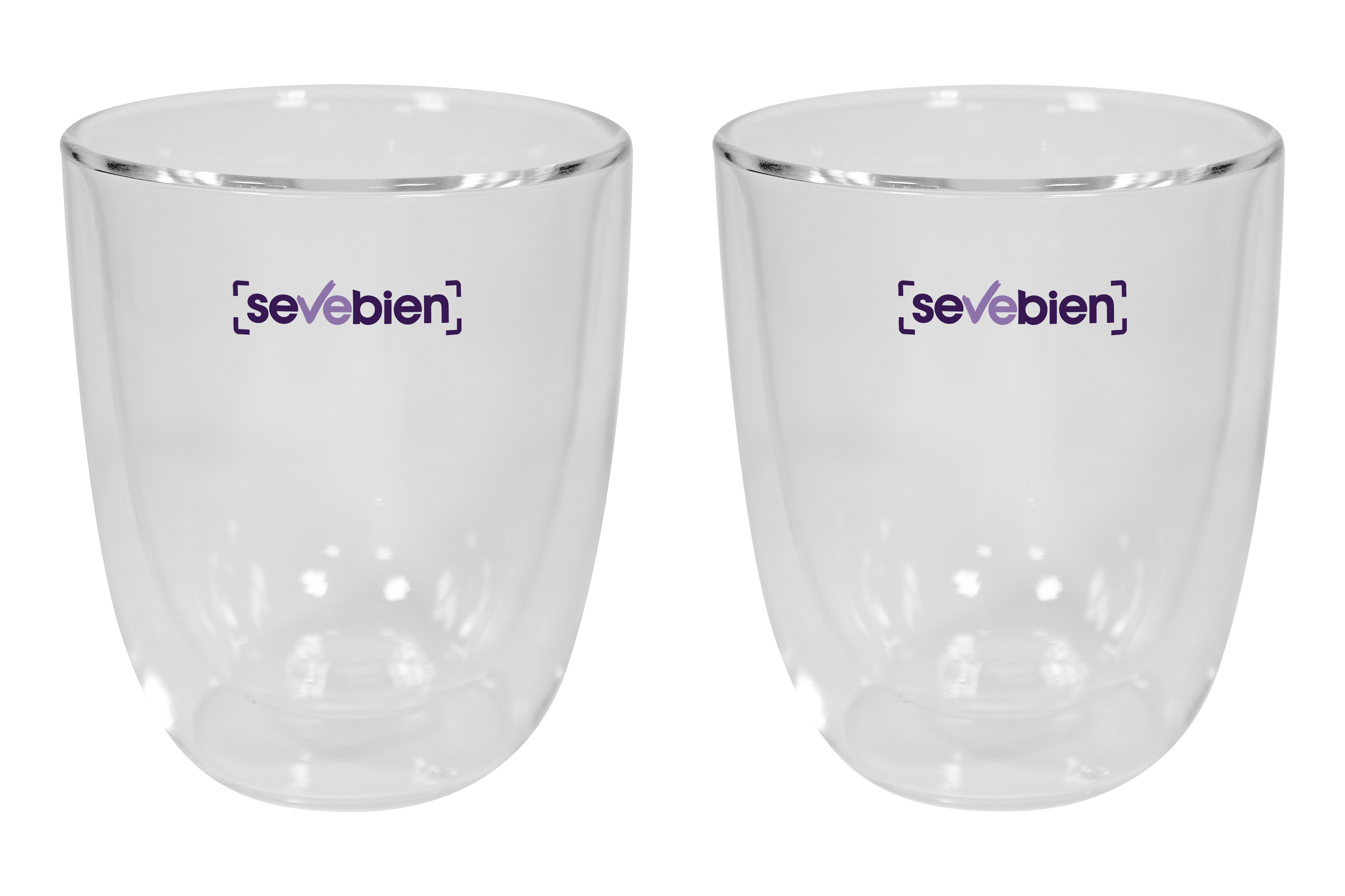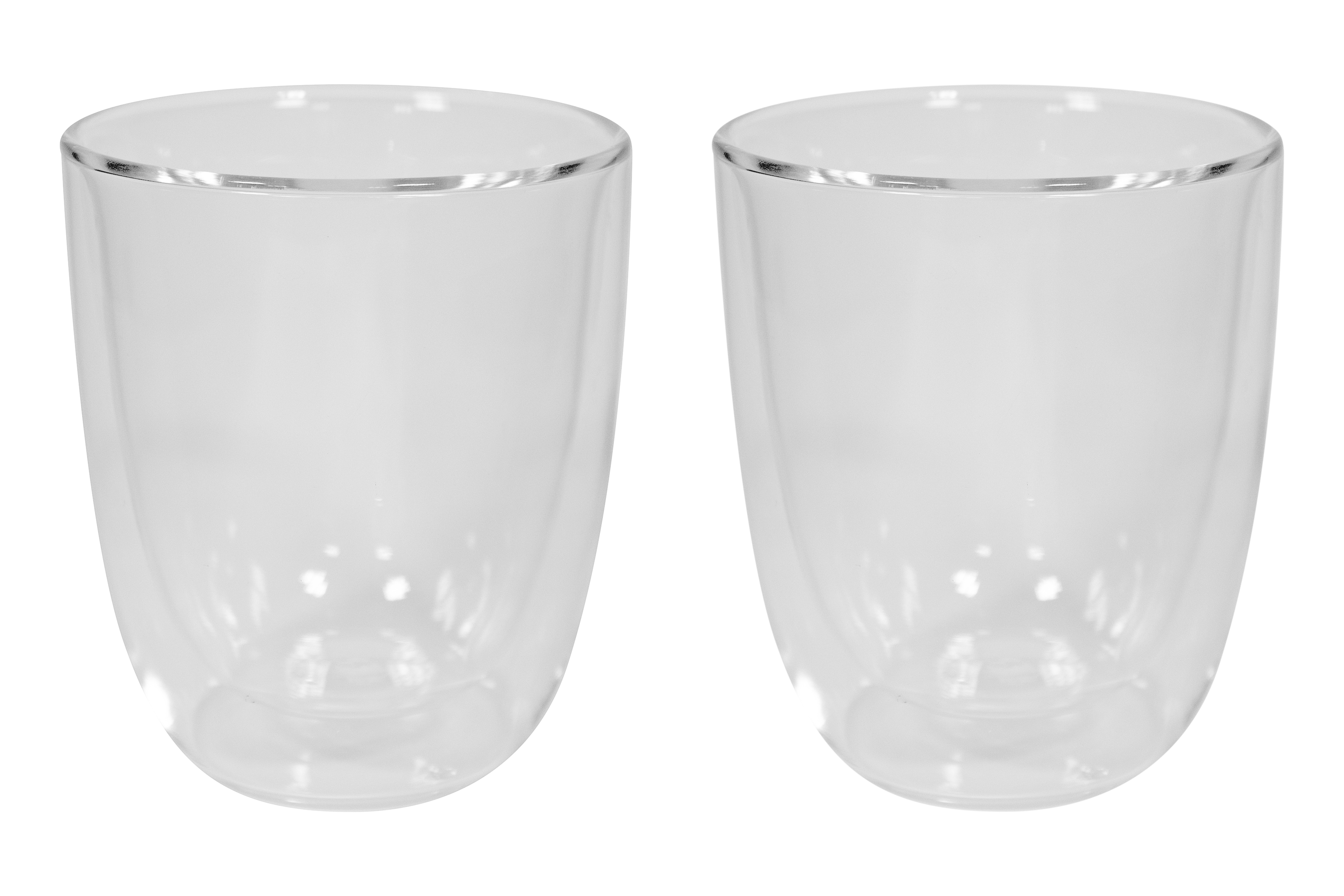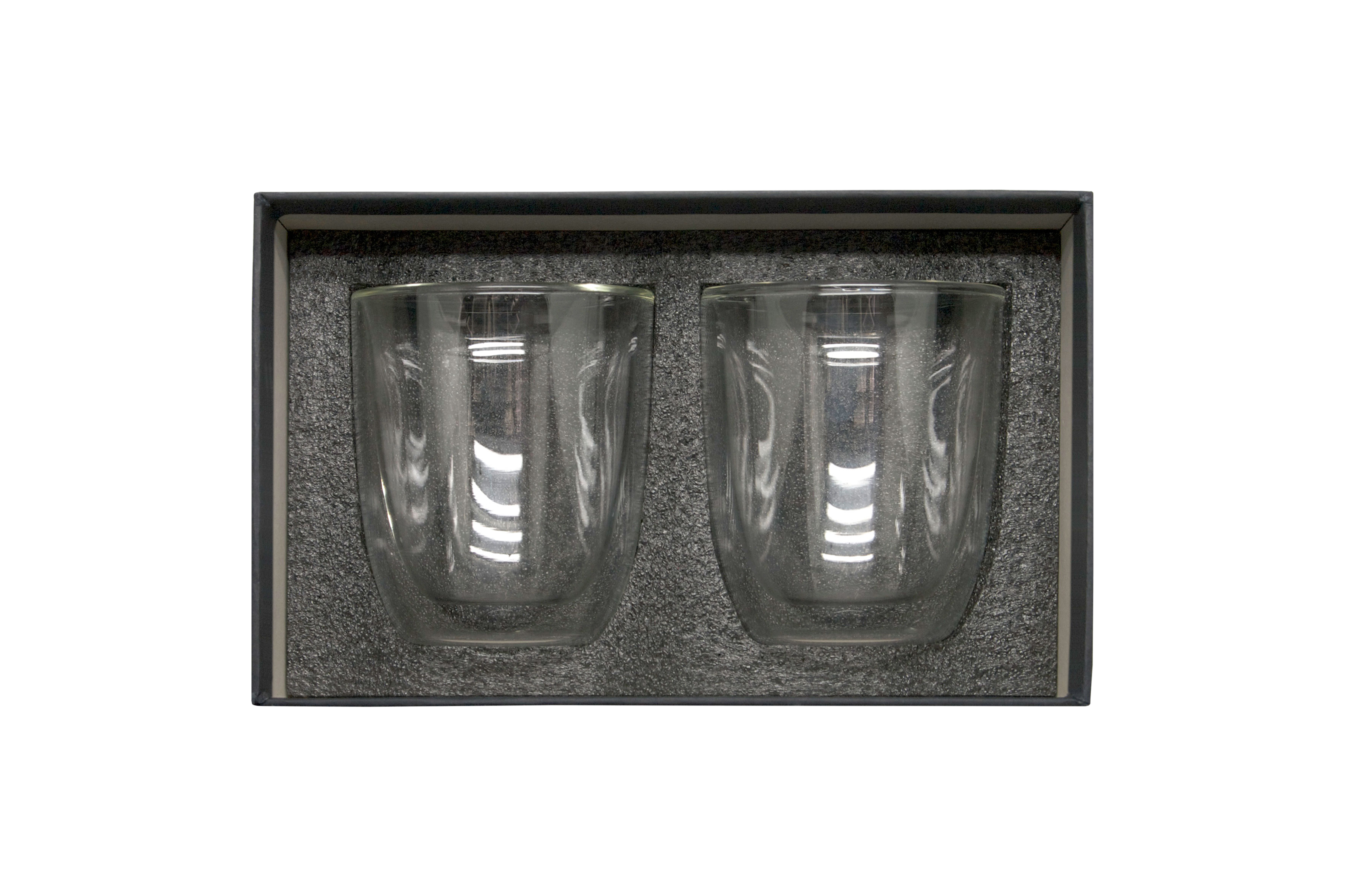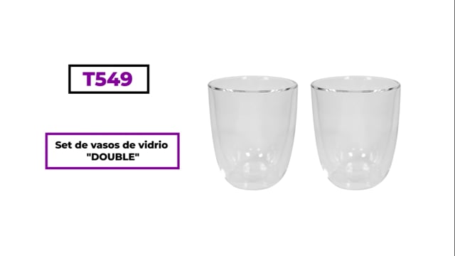 Ø 8,3 x 10 cm. Capacidad 280 ml cada vaso. Vidrio. Set de vasos doble pared. Apto para bebidas frías y calientes. Presentación en caja de regalo.