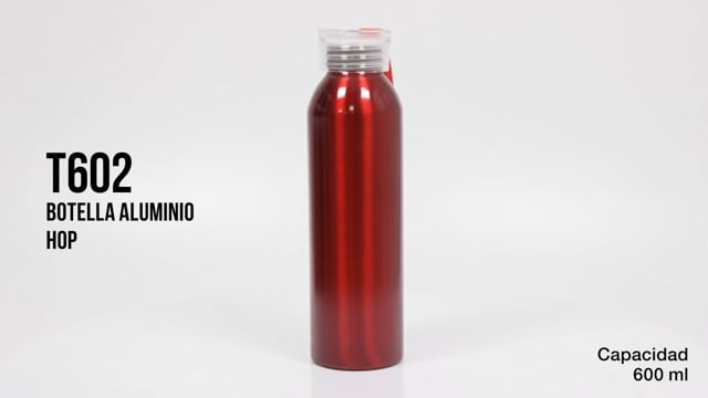 Ø 6,6 x 23,2 cm. Capacidad 600 ml. Aluminio. Botella de aluminio con cuerpo color. Tapa transparente con tira de silicona (de 8 cm) del mismo color que el cuerpo de la botella. Cuerpo de botella recubierto con pintura especial para facilitar la impresión del producto. Presentación en caja de regalo.