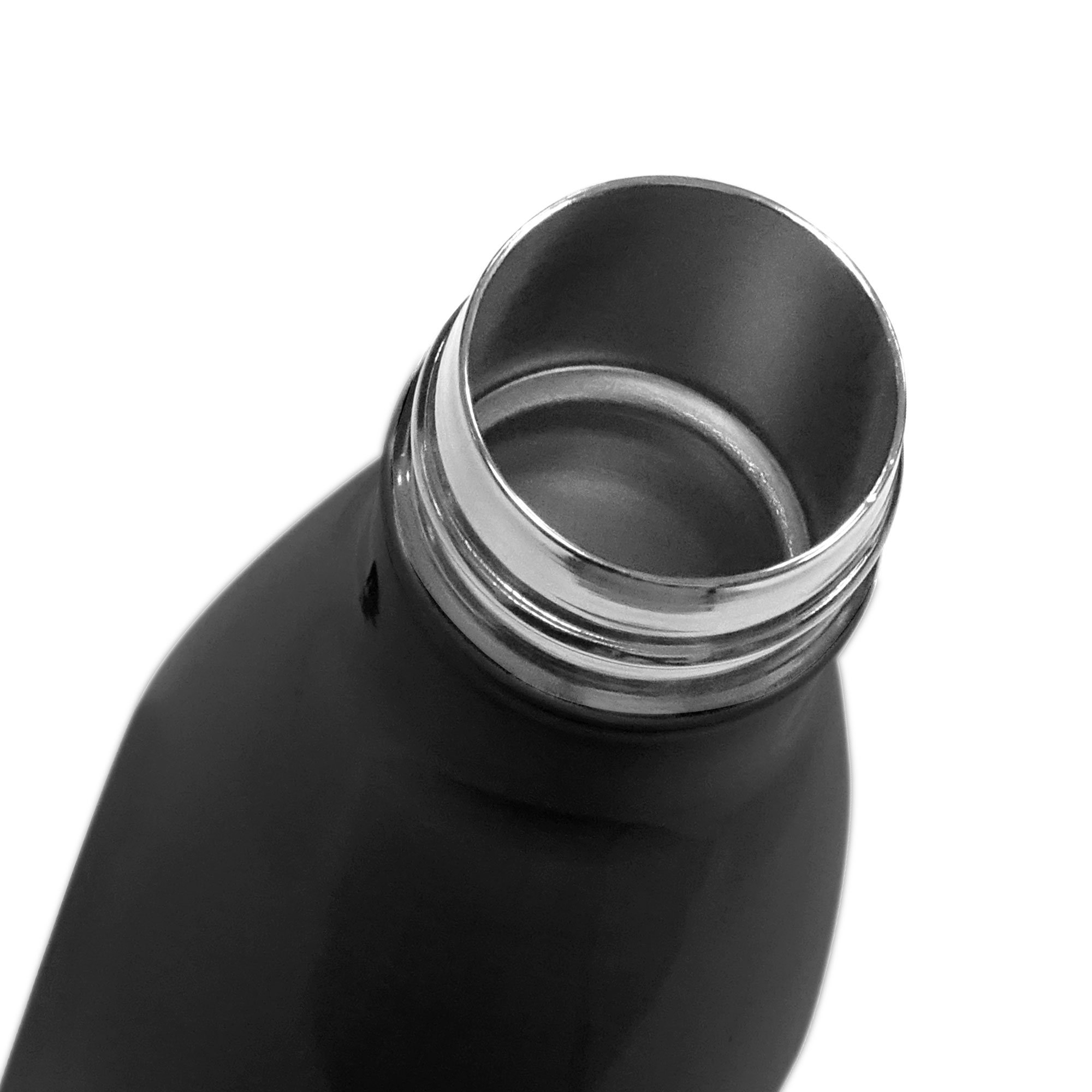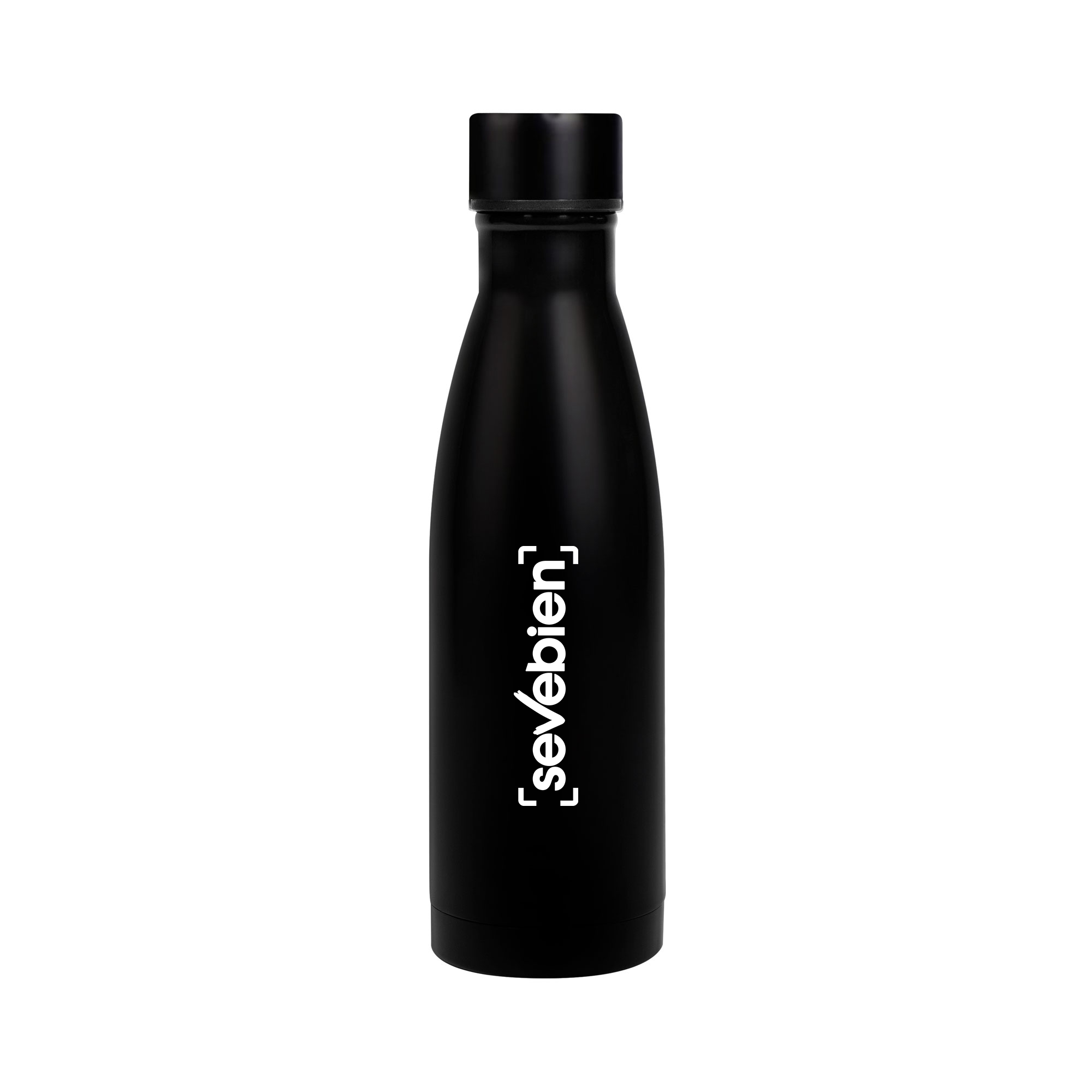 Ø 7 x 25,5 cm. Capacidad 500 ml. Acero inoxidable. Botella con aislamiento térmico vacuum. Interior de acero 304 y exterior de acero 201. Cuerpo y tapa a rosca del mismo color. Mantiene hasta 12 hs la temperatura de las bebidas calientes y 24 hs de las bebidas frías. Presentación en caja de regalo.