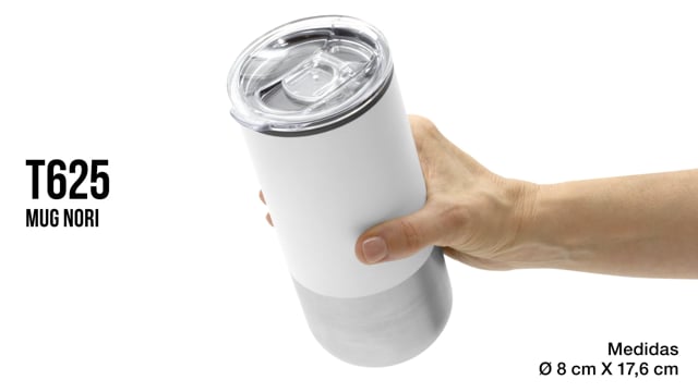 Ø 8 cm X 17.6 cm. Capacidad 500 ml. Polipropileno y acero inoxidable. Mug doble pared. Interior en plástico y exterior de acero inoxidable 201. Tapa plástica transparente a presión con anillo de silicona. Base antideslizante. Presentación en caja de regalo.