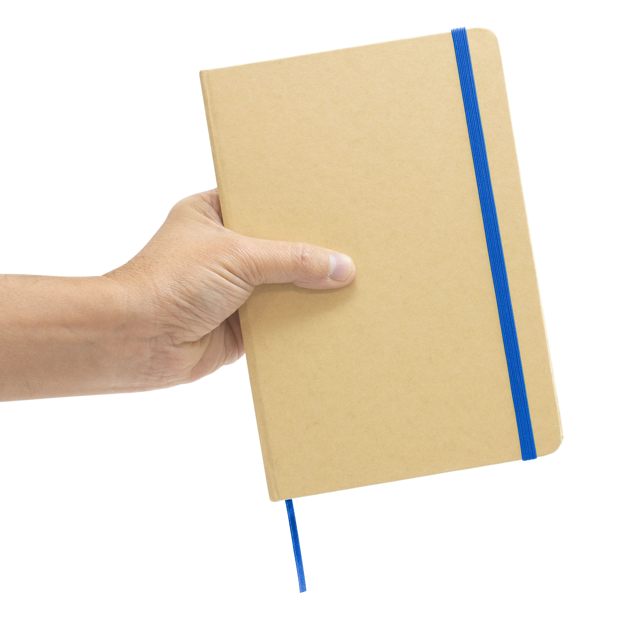 21 x 14 cm (A5). Cartón y Papel. Libreta. Tapa en papel kraft. Interior 80 hojas rayadas en papel de 70 g. Cinta señaladora y cierre elástico del mismo color.