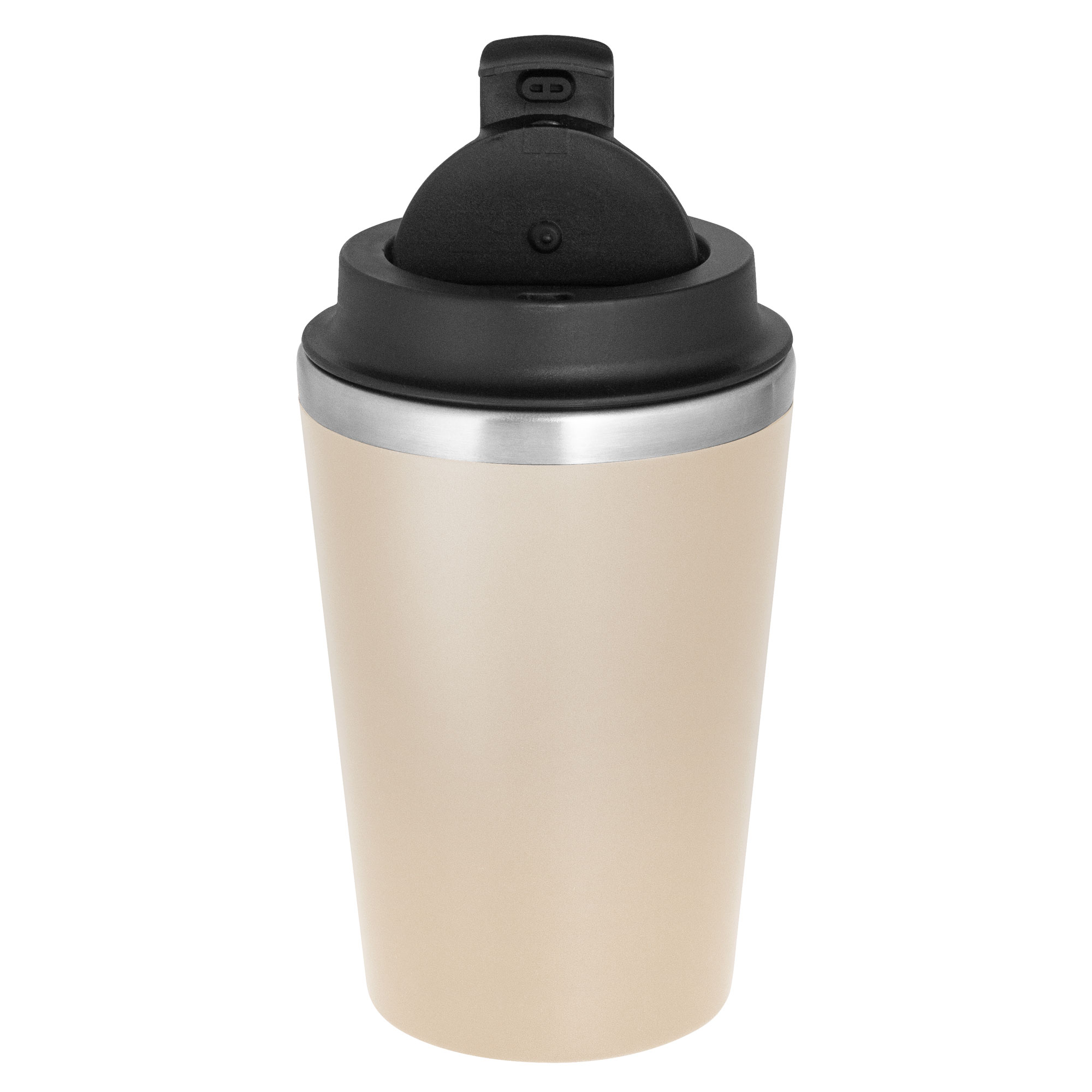 Mug doble pared. Interior de acero inoxidable 304 y exterior de polipropileno con acabado mate. Tapa de polipropileno con anillo de silicona y seguro antiderrame. Base antideslizante.
