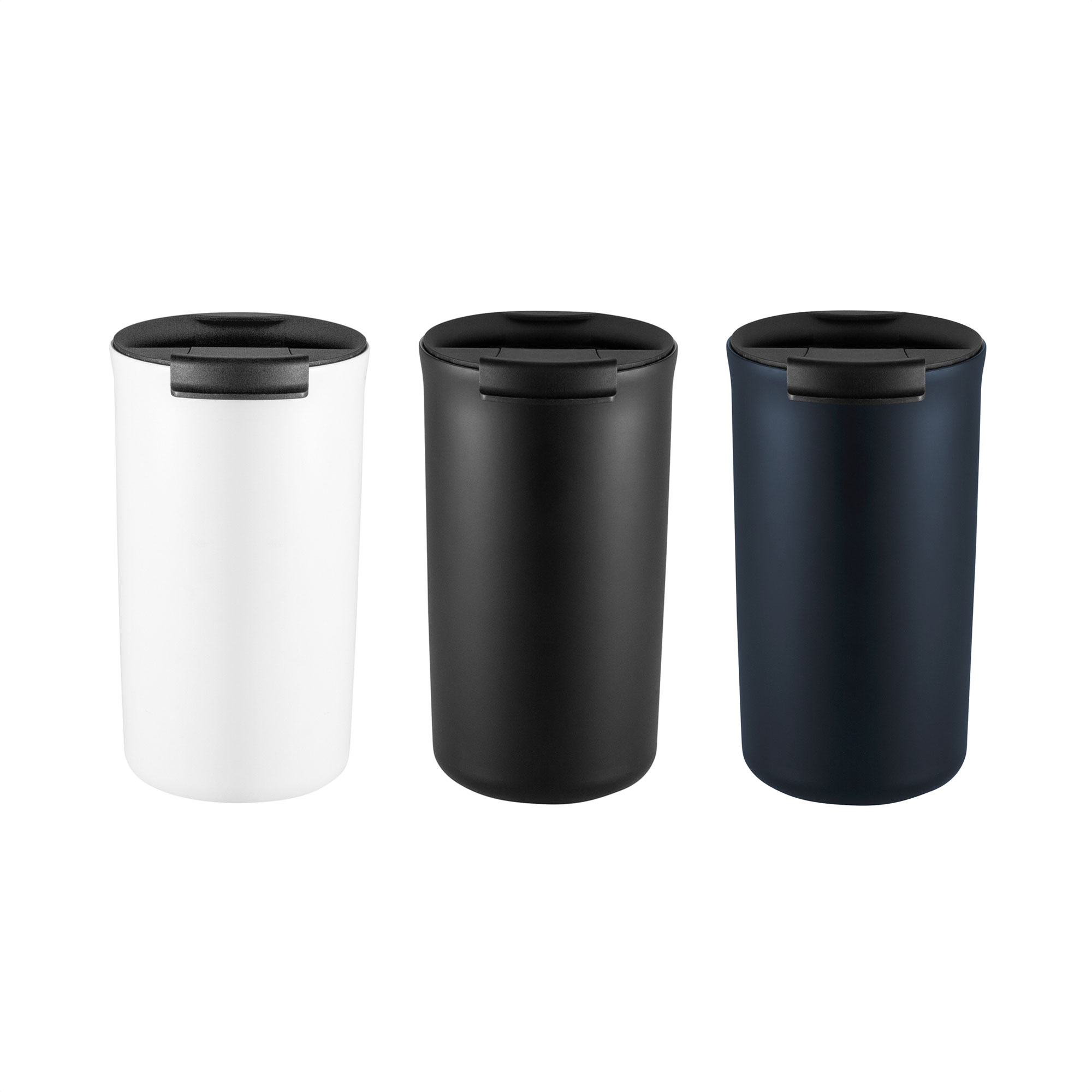 Mug térmico doble pared sellado al vacio. Aislamiento térmico. Tecnología vacuum. Interior en acero 304 y exterior en acero 201 con acabado mate. Tapa de polipropileno y anillo de silicona antivuelco. Base antideslizante con almohadilla de EVA color negro. Mantiene hasta 12 hs la temperatura de las bebidas calientes y 24 hs de las bebidas frías.