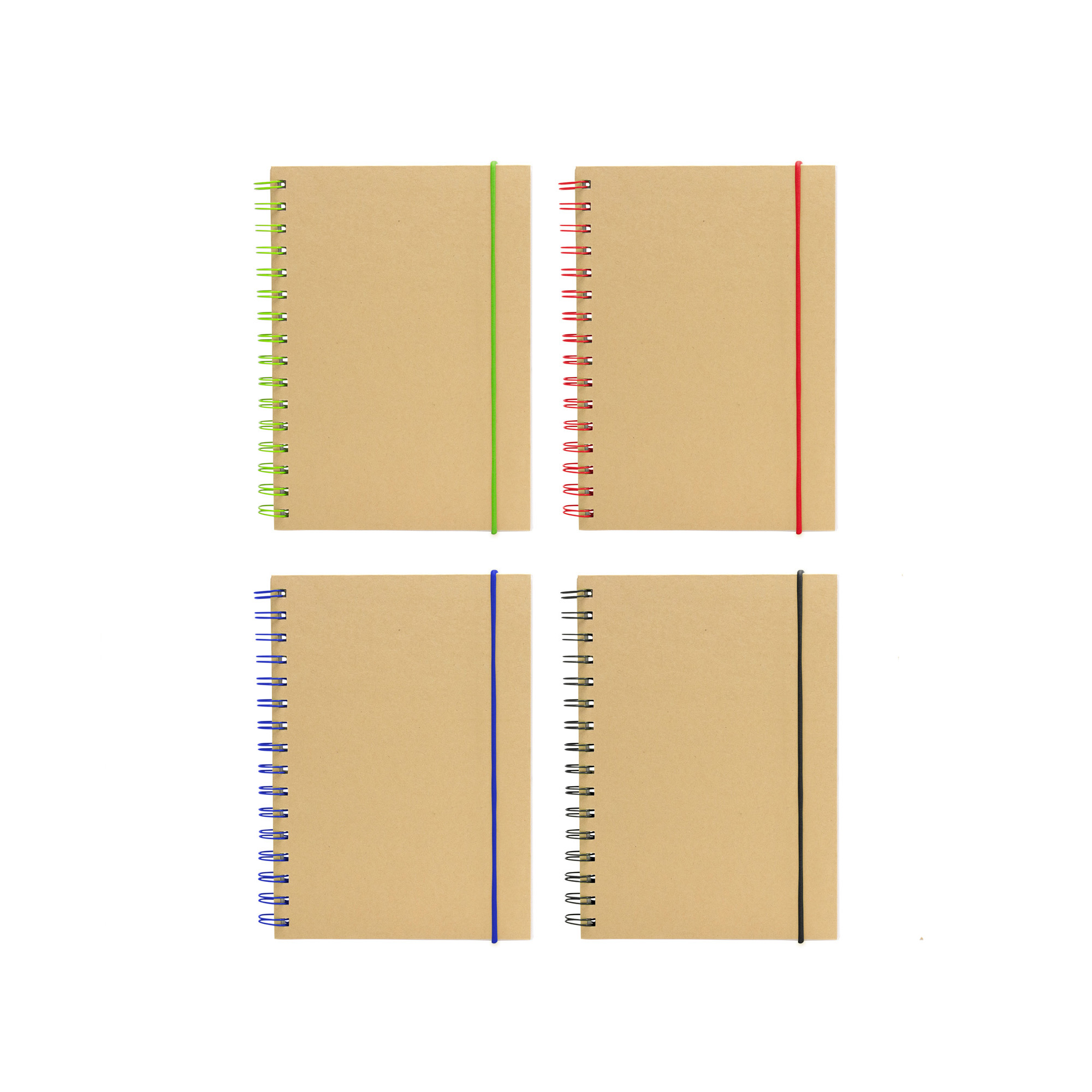 Libreta espiralada. Tapa recubierta en papel kraft de 120 g. Interior de 70 hojas blancas rayadas de 80 g. Cierre con banda elástica y espiral del mismo color.