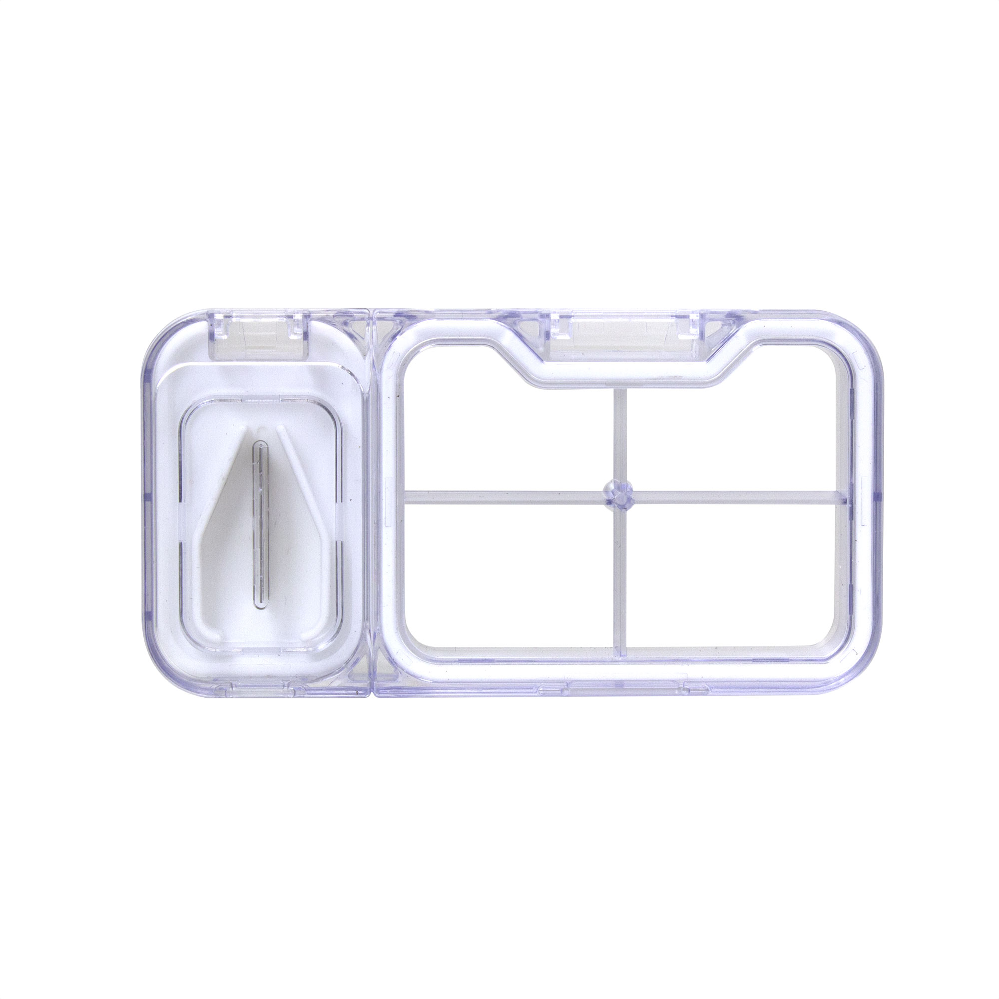 Pastillero organizador corta pastilla. Compartimento principal con cuatro divisiones y recubrimiento perimetral de silicona. Compartimento secundario con base de silicona y soporte regulable de pastillas. Cuchilla de acero incorporada en la tapa. Ambos compartimentos con tapa rebatible y cierre a presión.