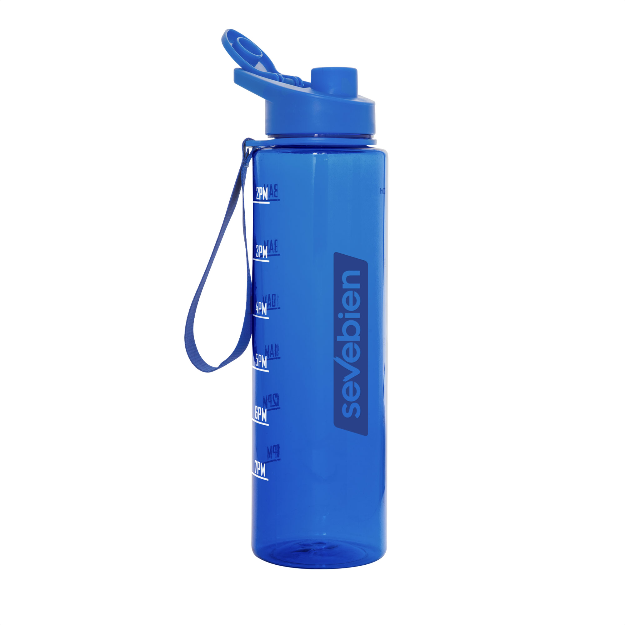 Botella con marcador de tiempo y medida. Color translúcido con tapa plástica flip top con asa, boquilla y correa del mismo color de la botella.