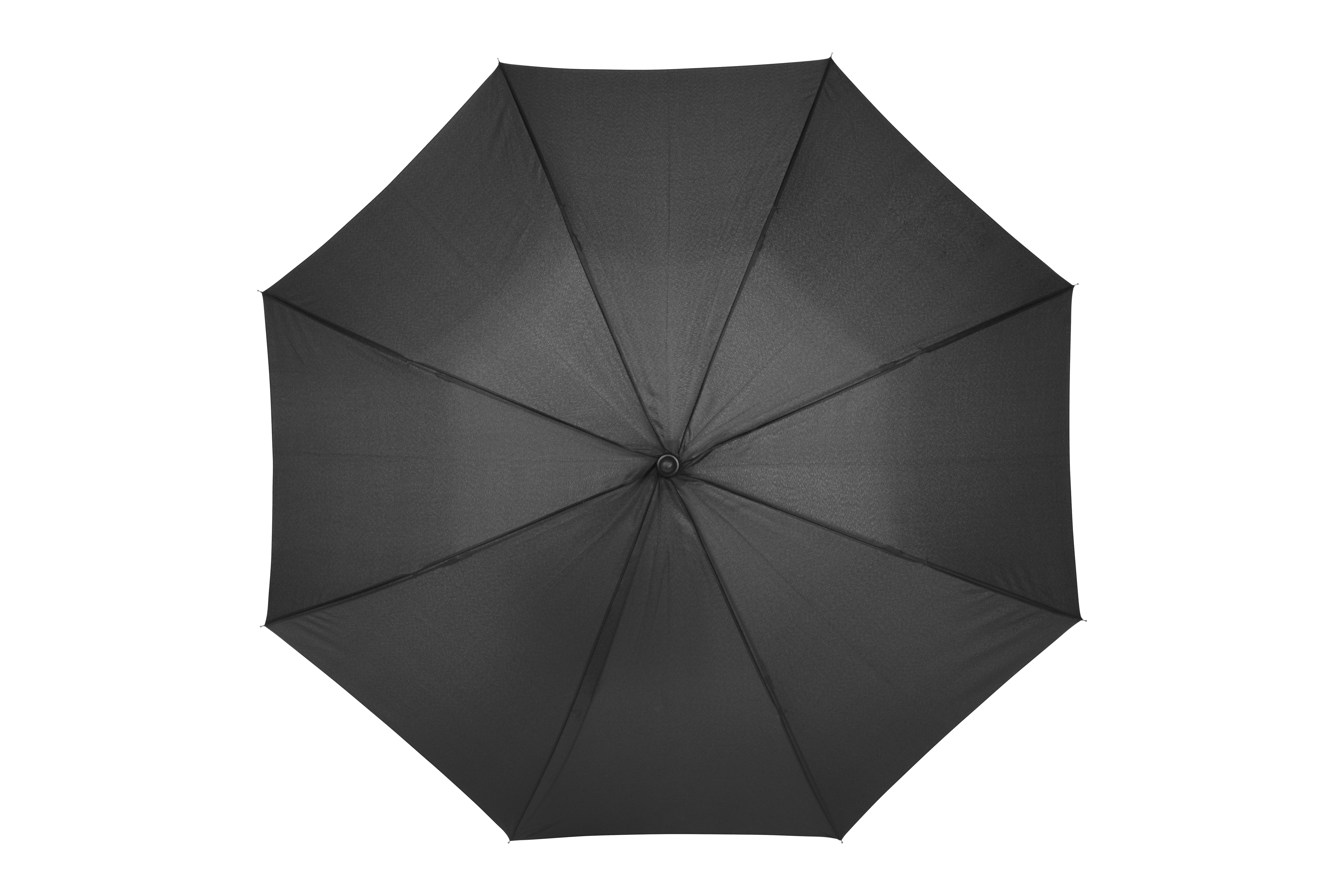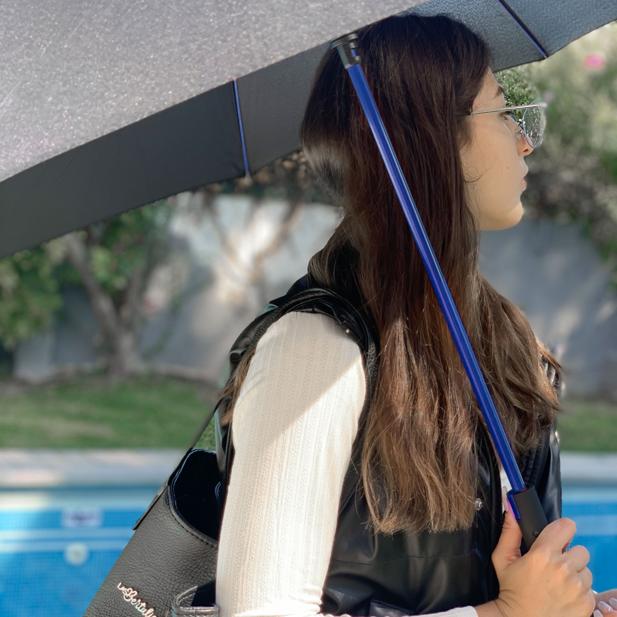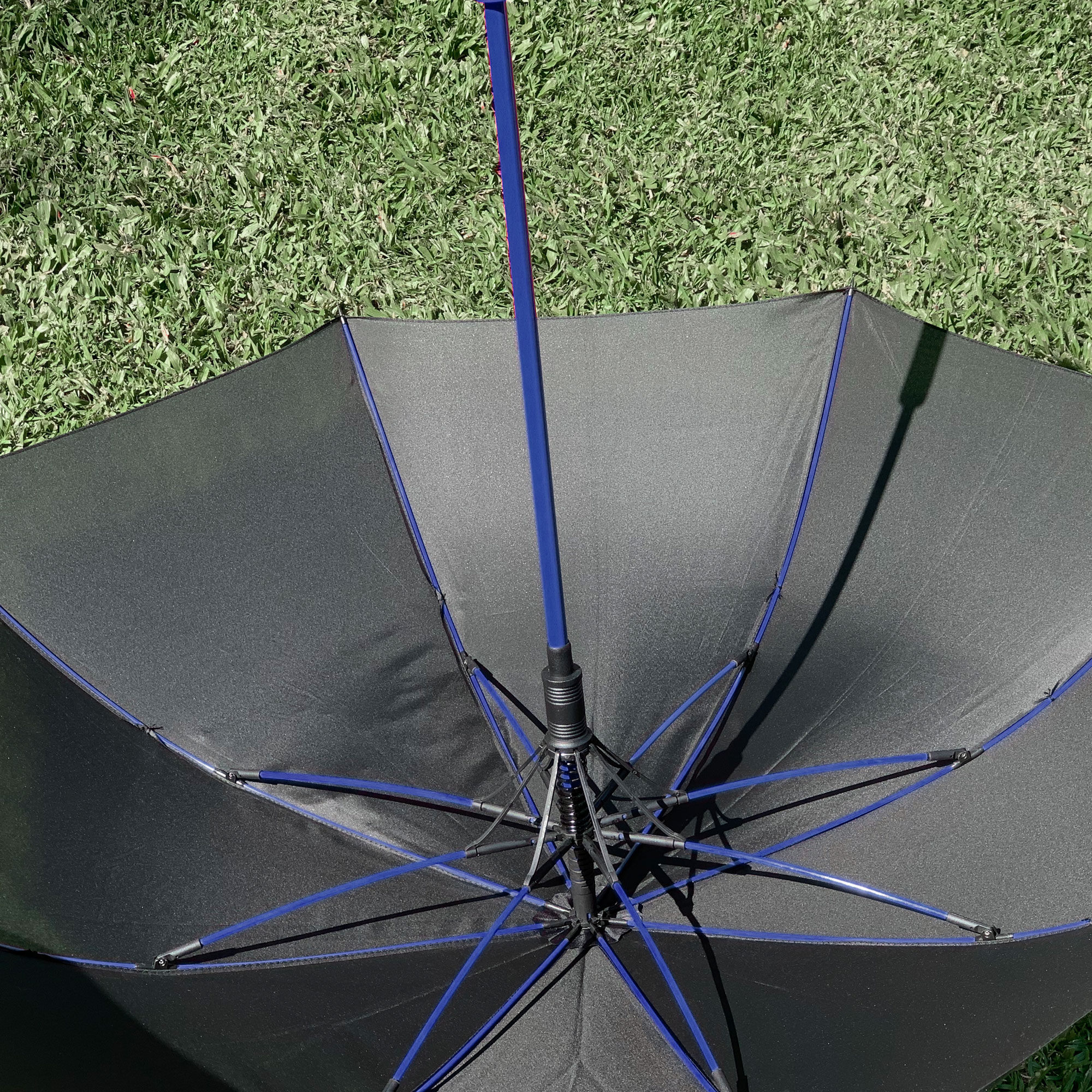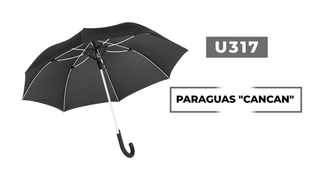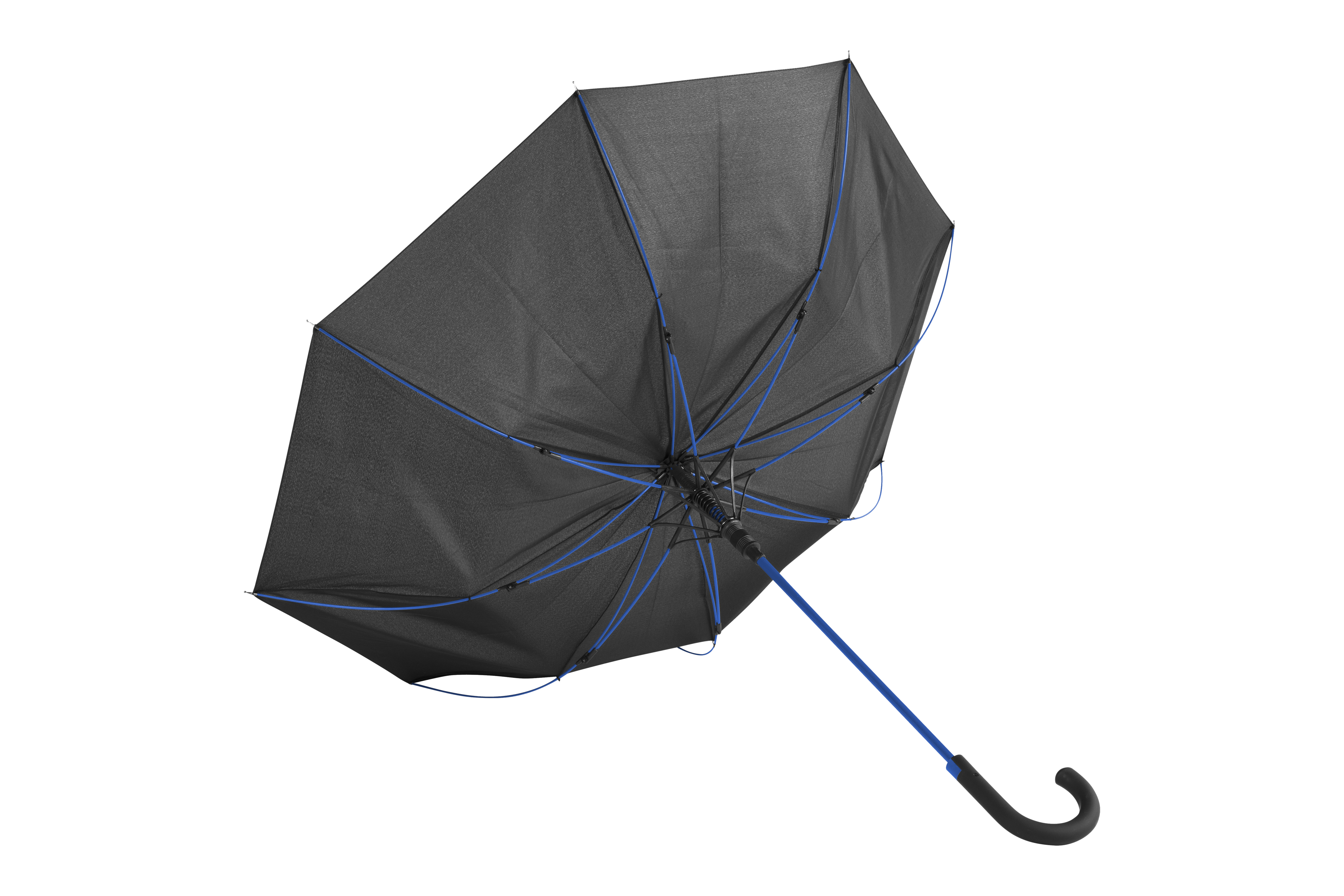 Ø 103 cm. Poliéster Pongee. Paraguas APERTURA AUTOMÁTICA. Eje de metal y varillas de fibra de vidrio de color, puntas metálicas. Mango curvo de goma con botón de color. Cierre con correa de velcro.