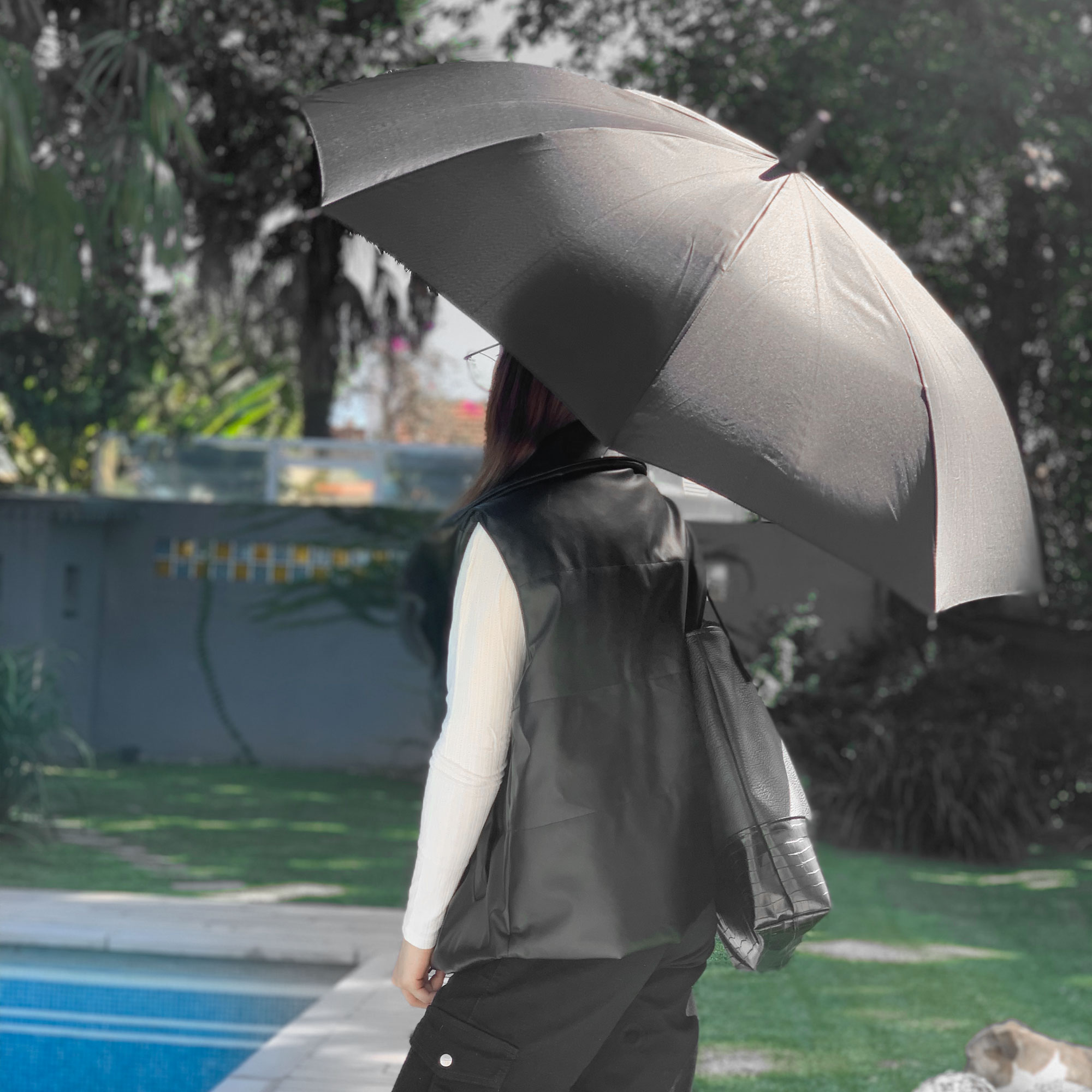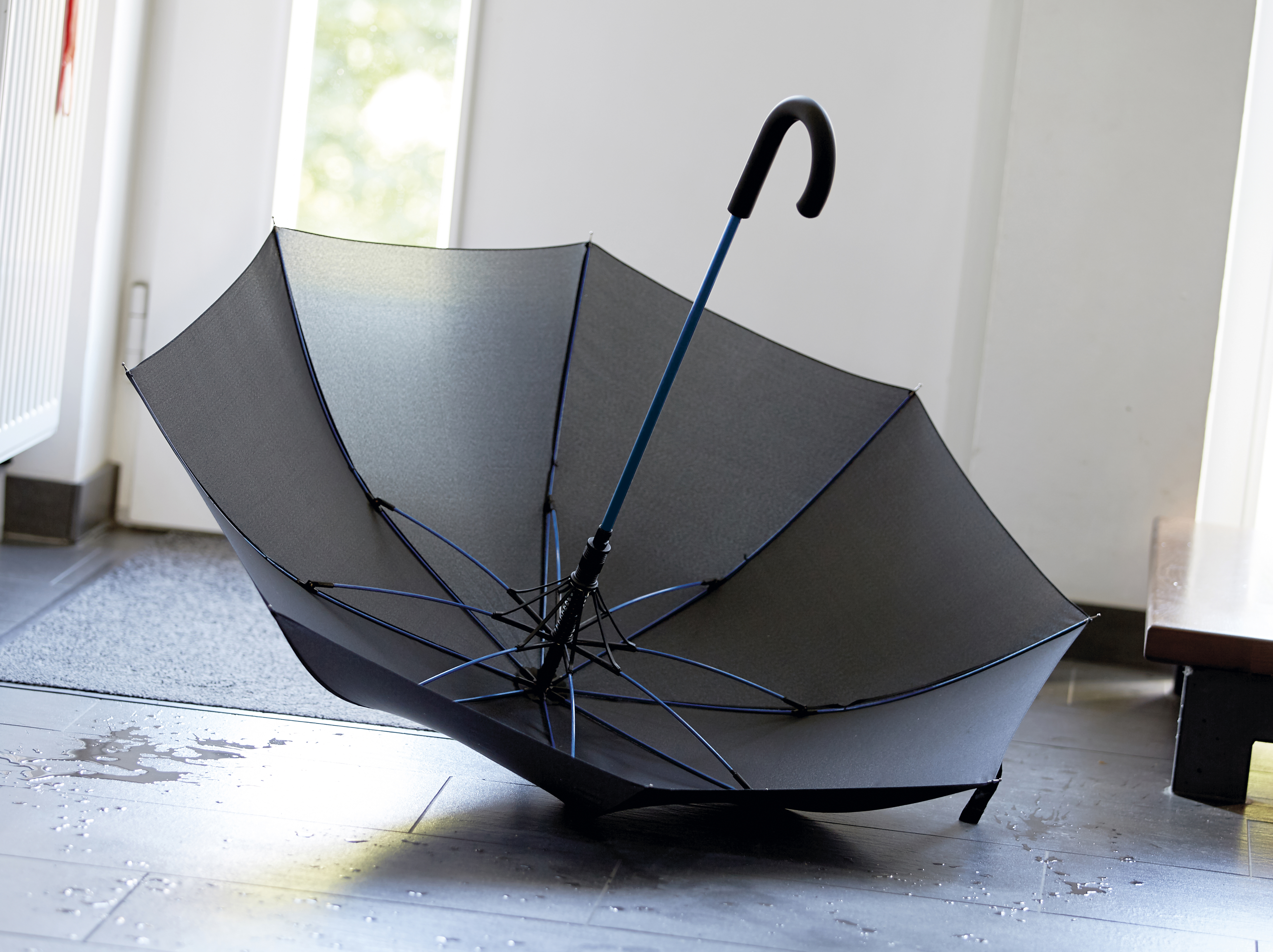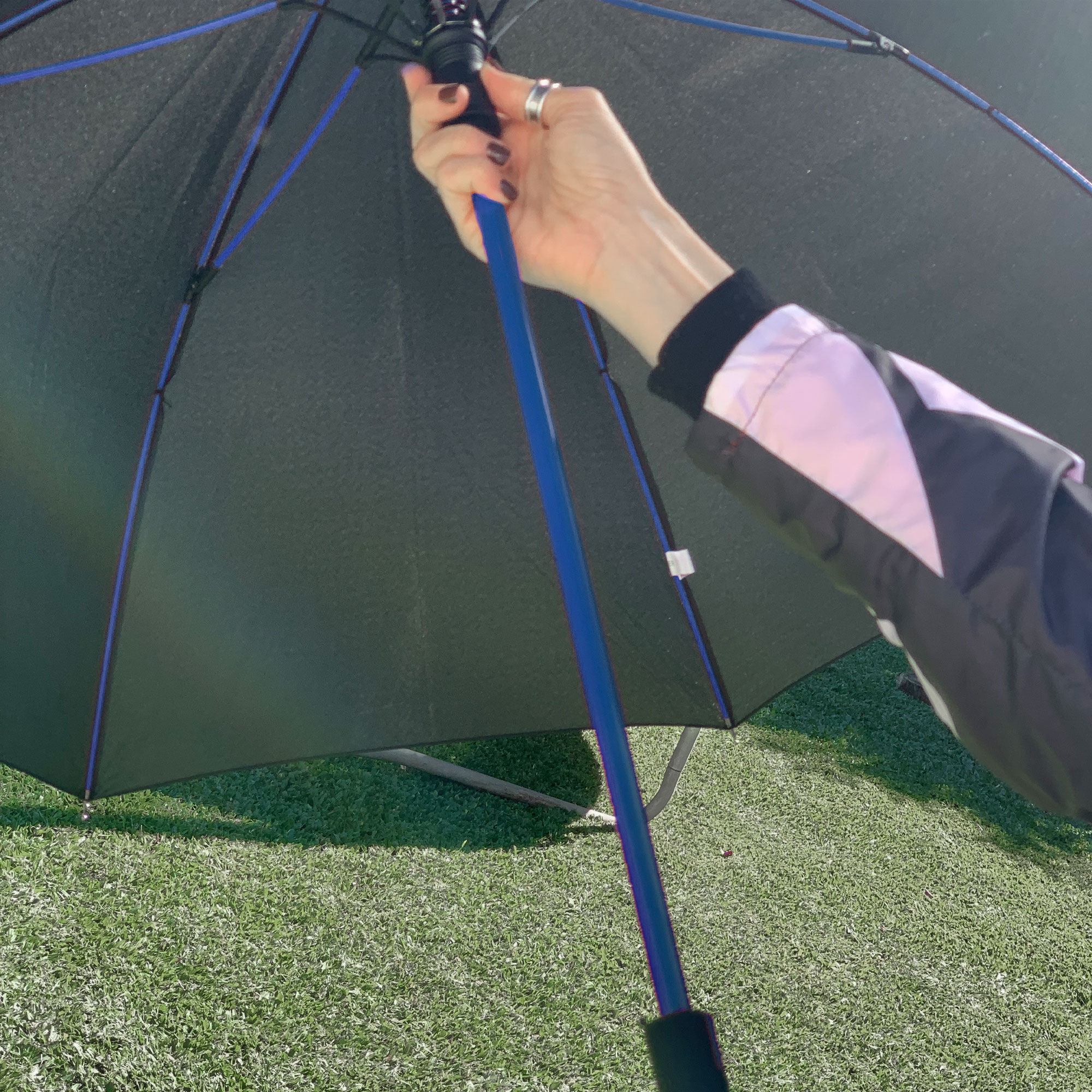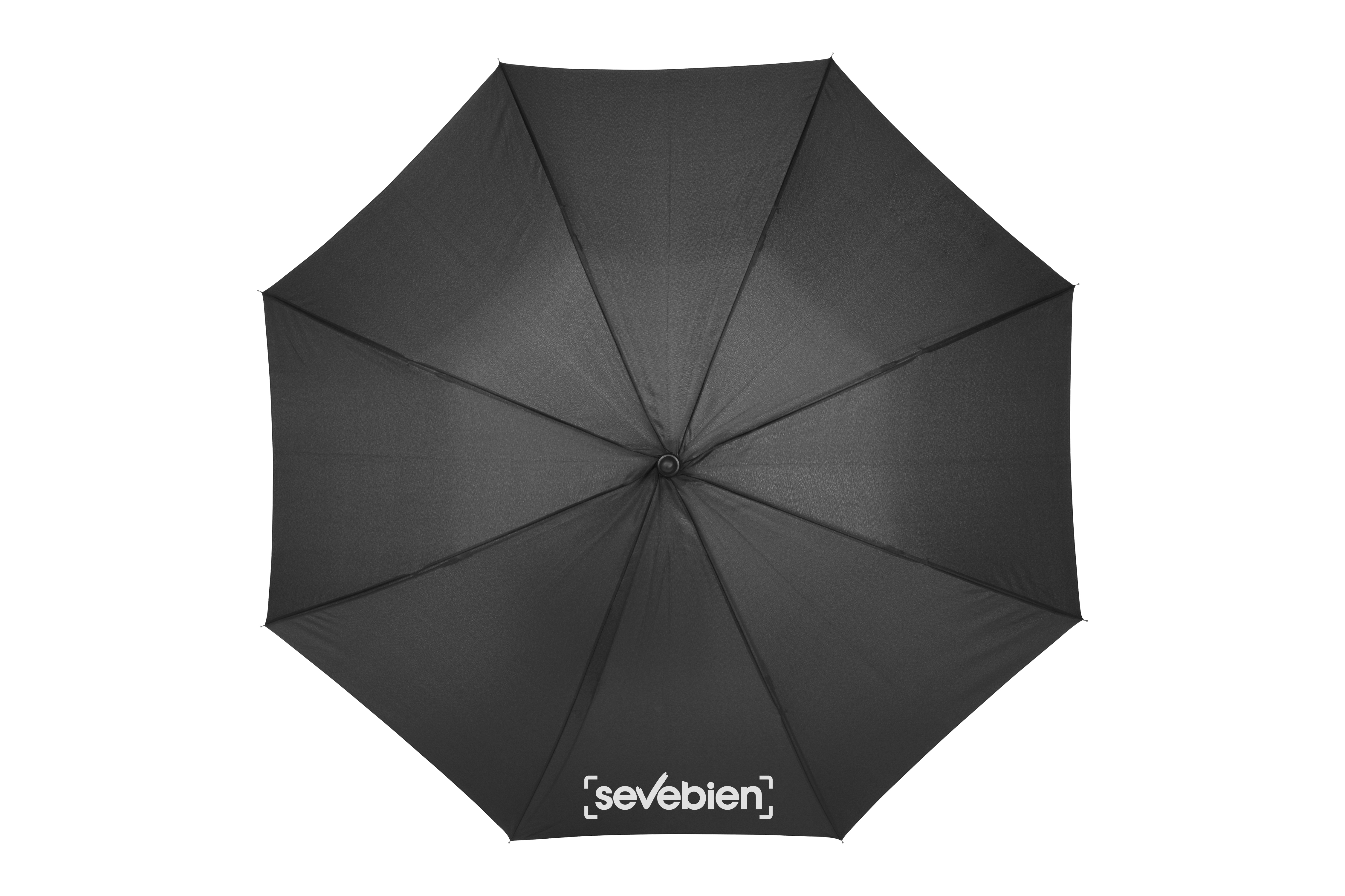 Ø 103 cm. Poliéster Pongee. Paraguas APERTURA AUTOMÁTICA. Eje de metal y varillas de fibra de vidrio de color, puntas metálicas. Mango curvo de goma con botón de color. Cierre con correa de velcro.