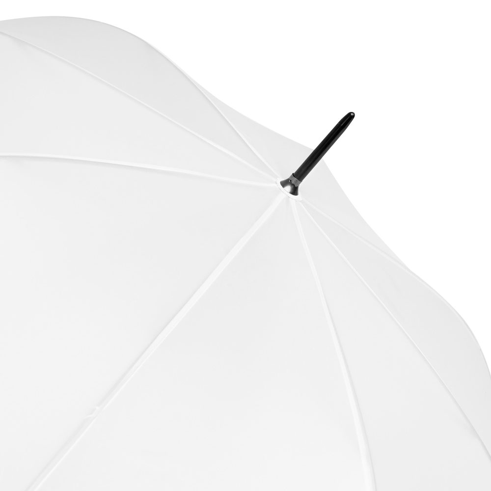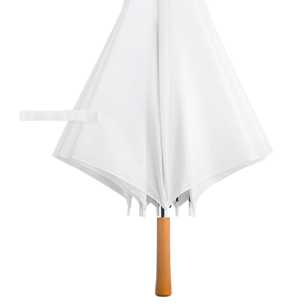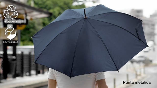 Ø 100 cm. 8 gajos. Ancho gajo 40 cm. Largo total 84 cm. Poliéster, metal y PVC. Paraguas APERTURA AUTOMÁTICA Y CIERRE MANUAL. Eje, varillas y punta metálicas y mango en PVC, símil madera. Botón a presión. Cierre con correa de velcro.