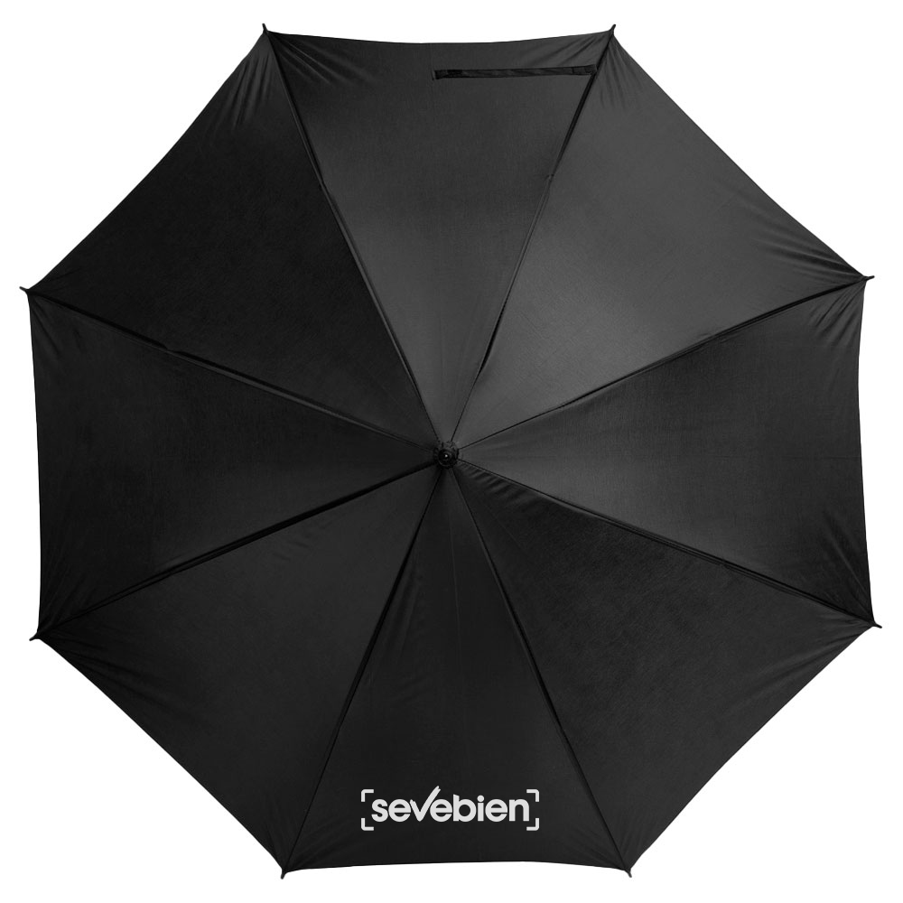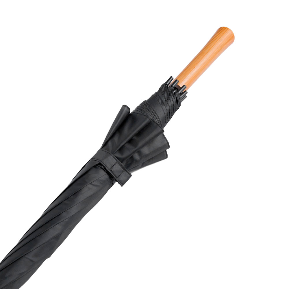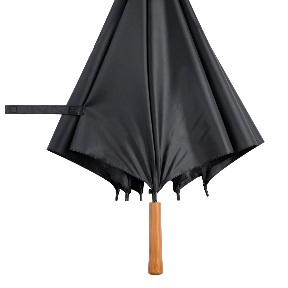 Ø 100 cm. 8 gajos. Ancho gajo 40 cm. Largo total 84 cm. Poliéster, metal y PVC. Paraguas APERTURA AUTOMÁTICA Y CIERRE MANUAL. Eje, varillas y punta metálicas y mango en PVC, símil madera. Botón a presión. Cierre con correa de velcro.