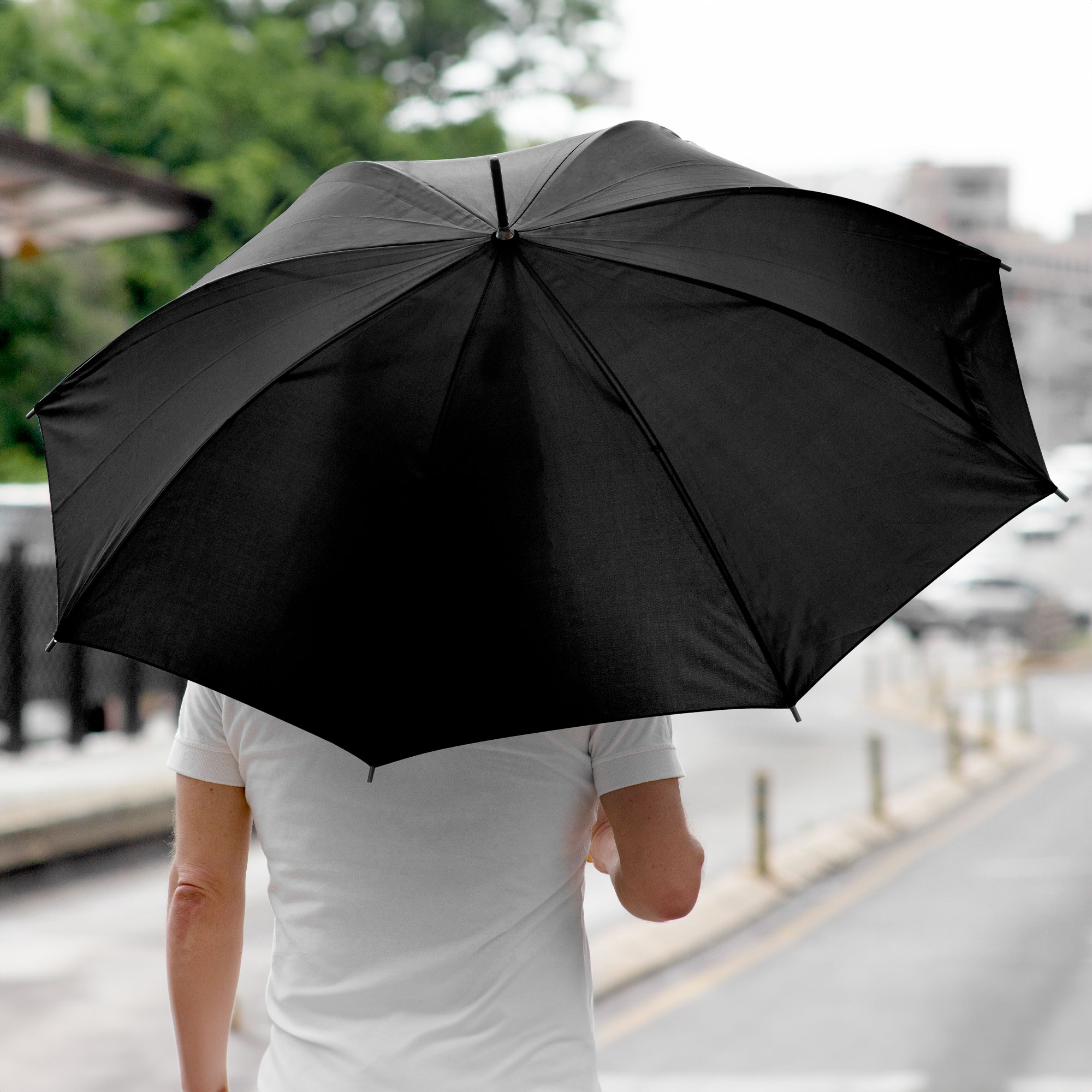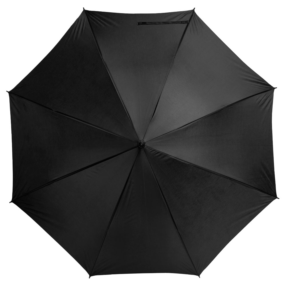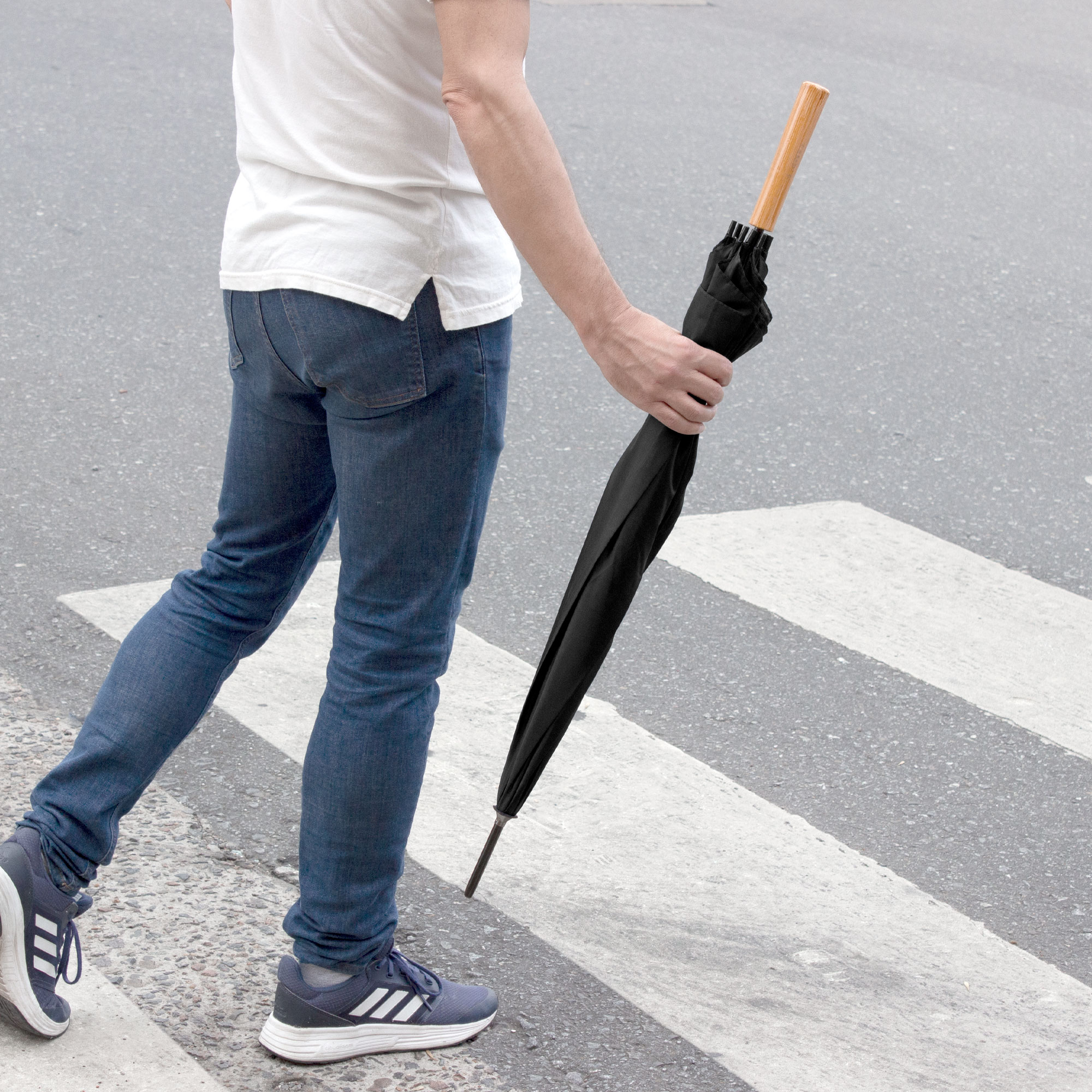 Ø 100 cm. 8 gajos. Ancho gajo 40 cm. Largo total 84 cm. Poliéster, metal y PVC. Paraguas APERTURA AUTOMÁTICA Y CIERRE MANUAL. Eje, varillas y punta metálicas y mango en PVC, símil madera. Botón a presión. Cierre con correa de velcro.